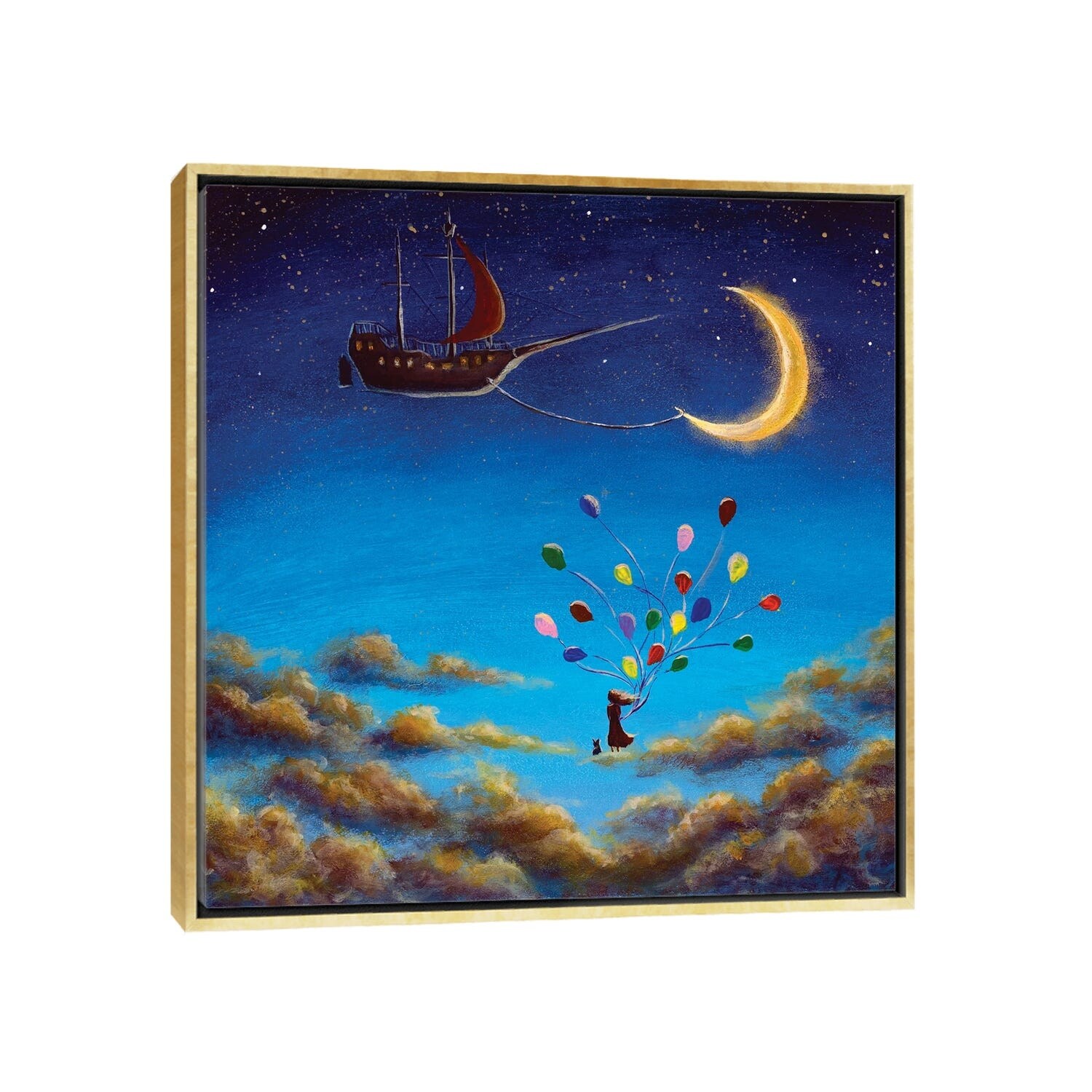 iCanvas "Girl With Balloons And Cat on Clouds in Sky Looks At Ship And Big Moon" by Valery Rybakow Framed