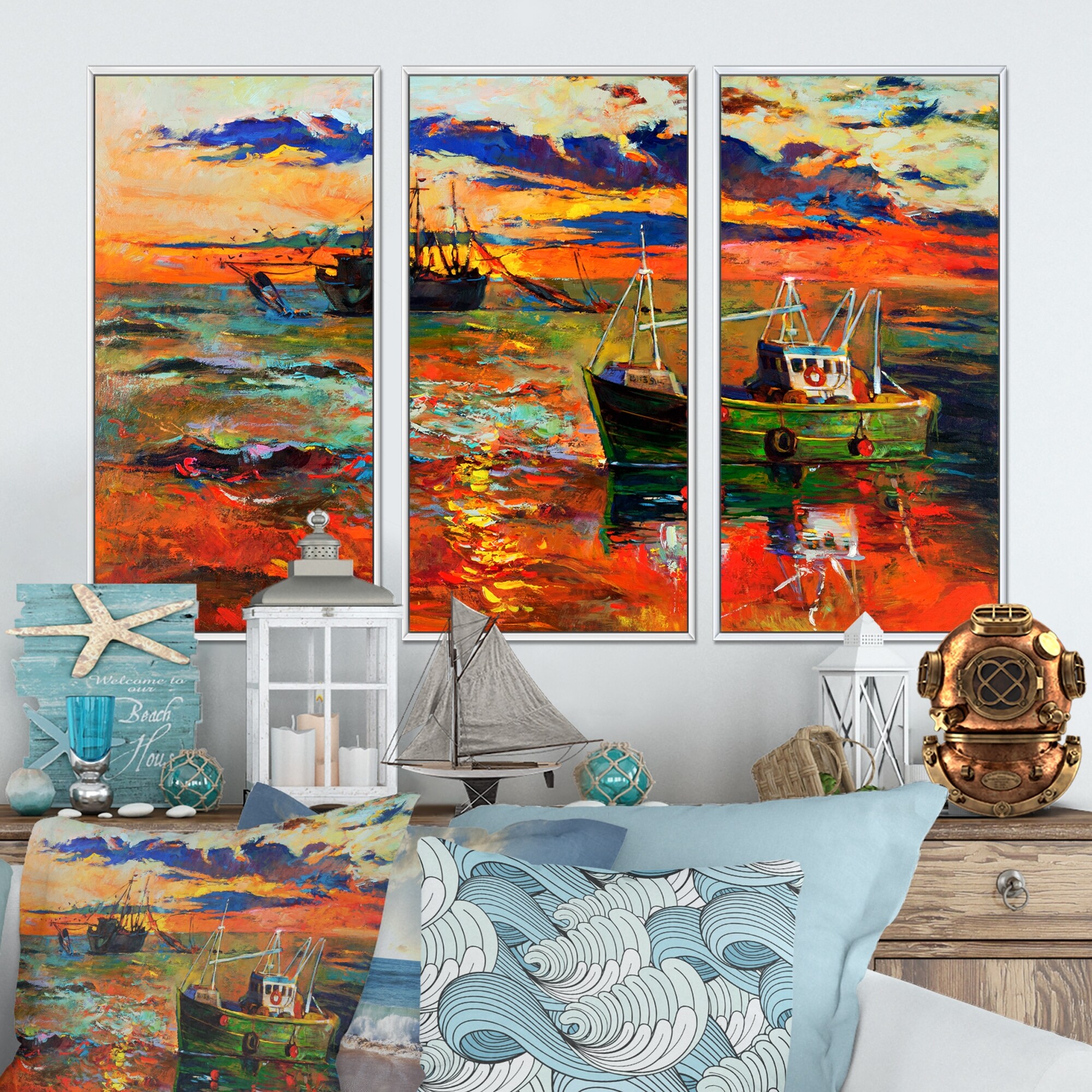 Designart "Colorful Fishing Ships" Sea & Shore Framed Canvas Wall Art Set of 3 - 4 Colors of Frames