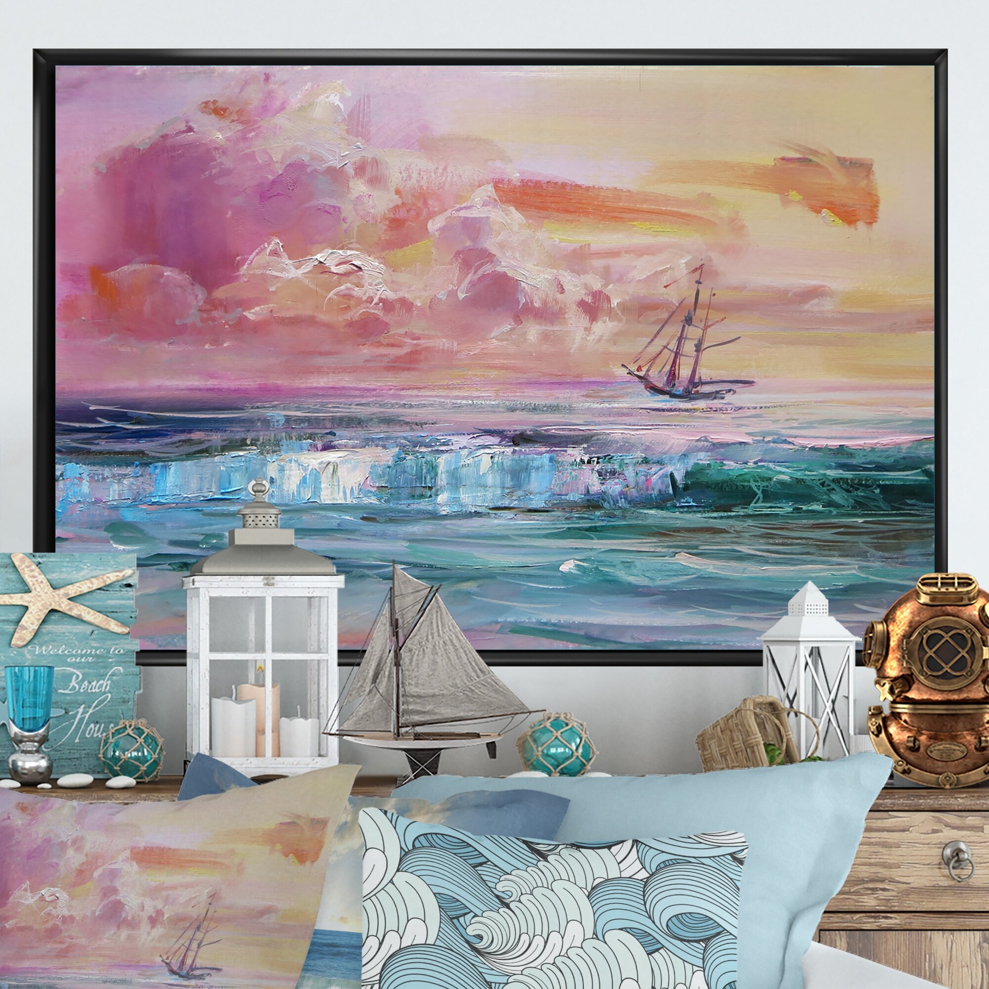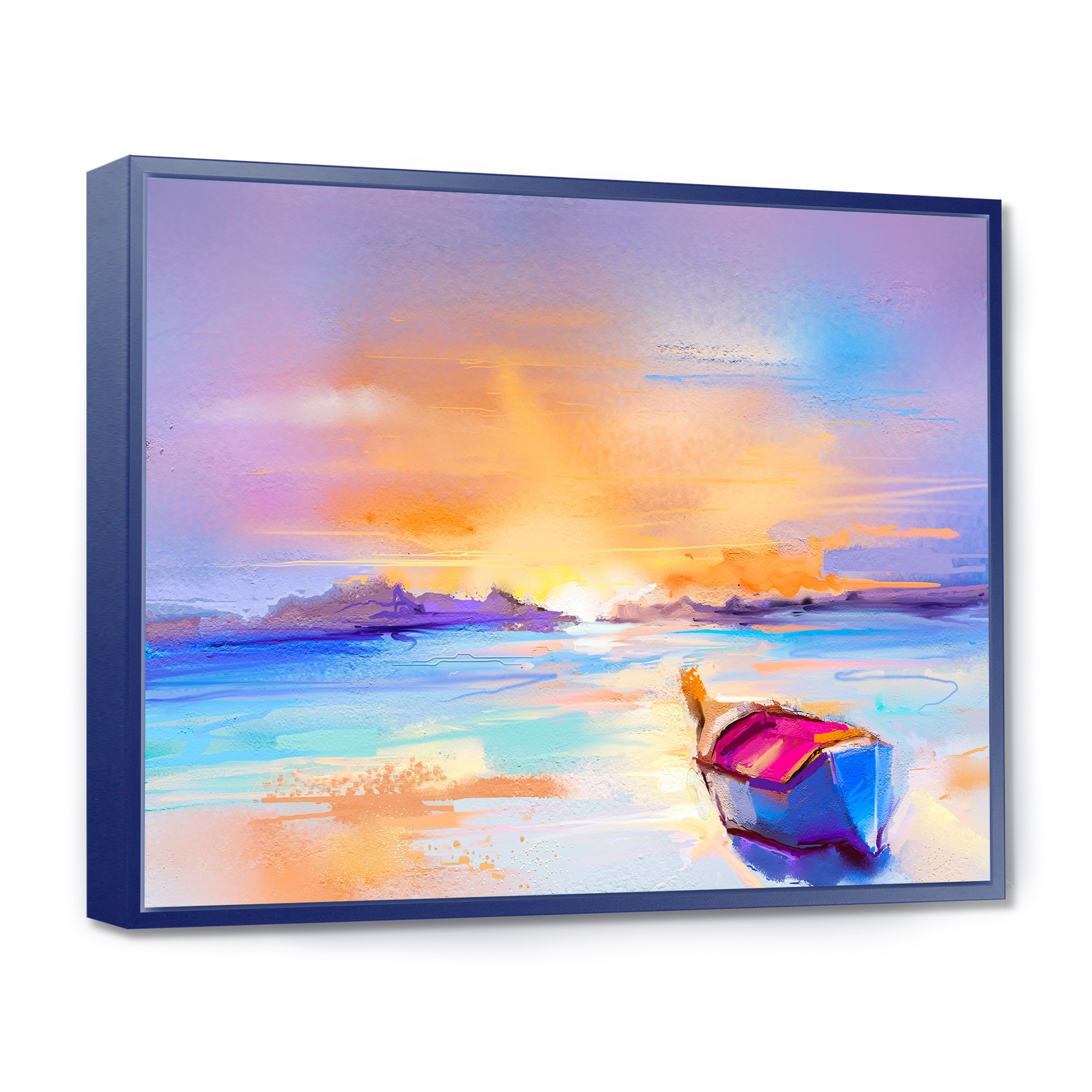 Designart "Little Ships on Pink Seascape Sky" Modern & Contemporary Framed Canvas Wall Art Print