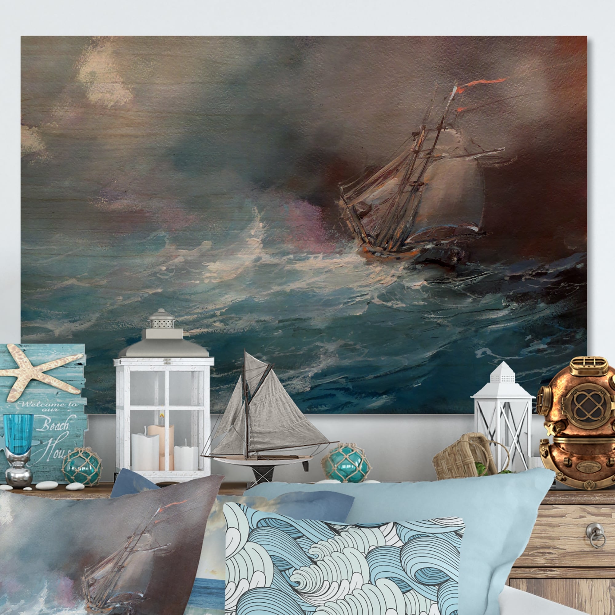 Designart "Ship In the Middle of a Storm I" Modern Landscape Beach Framed Canvas Wall Art