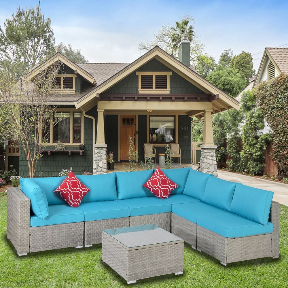 7-Piece PE Rattan Wicker Sectional Cushioned Sofa Sets with 2 Pillows and Coffee Table