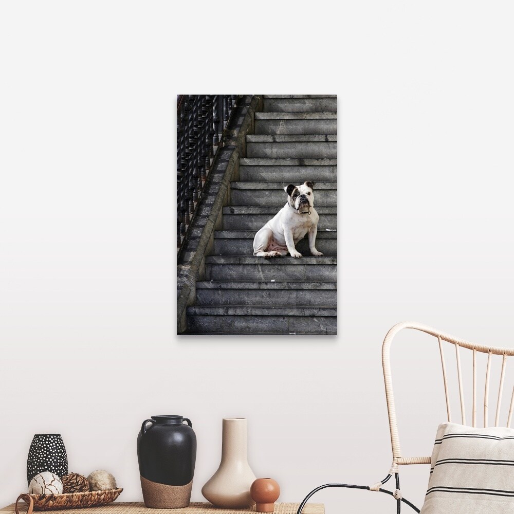 "A bulldog sits on steps in Mundaka, Spain" Canvas Wall Art