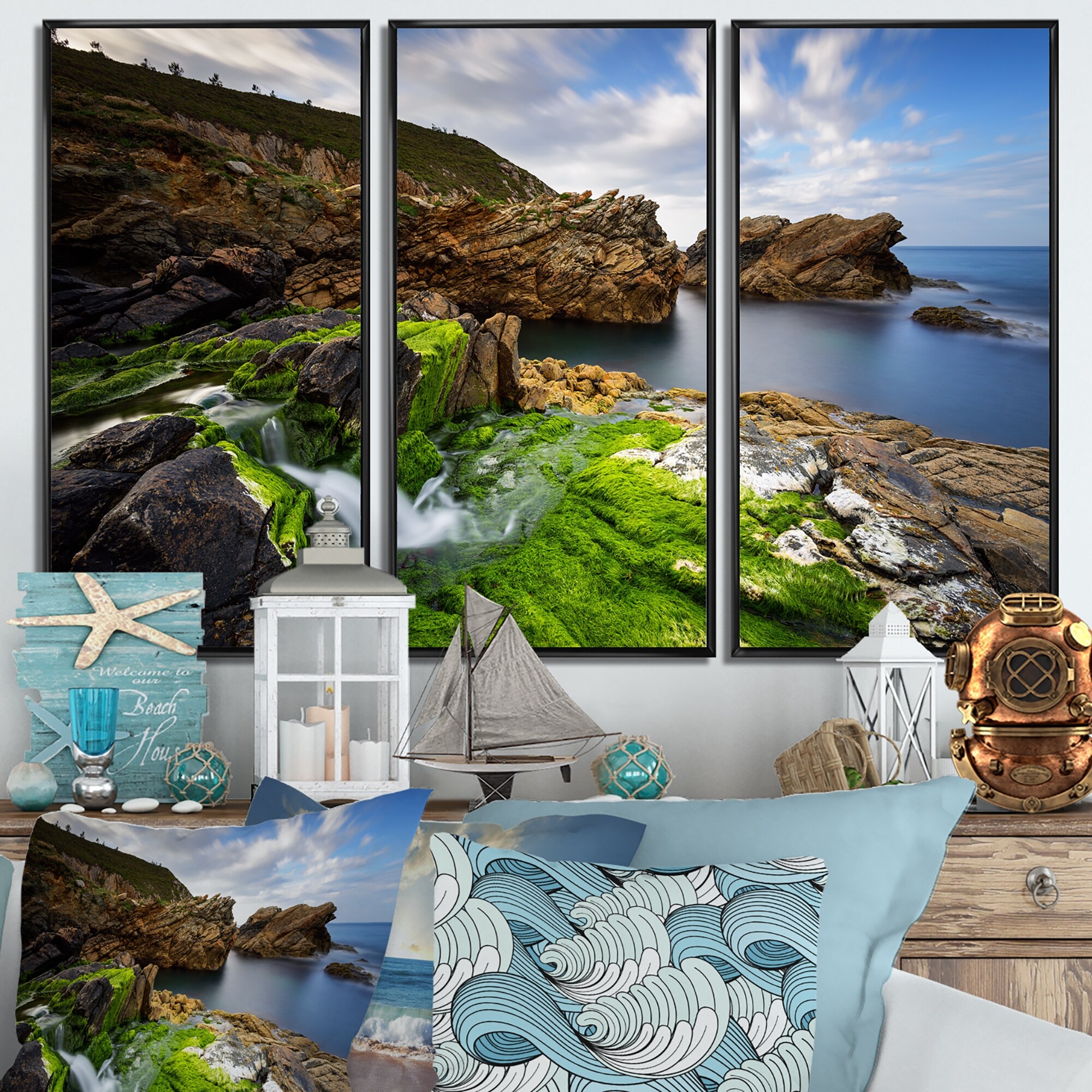 Designart "Rocks and Waterfall in Spanish Coast" Beaches Framed Wall Decor Set of 3 - 4 Colors of Frames