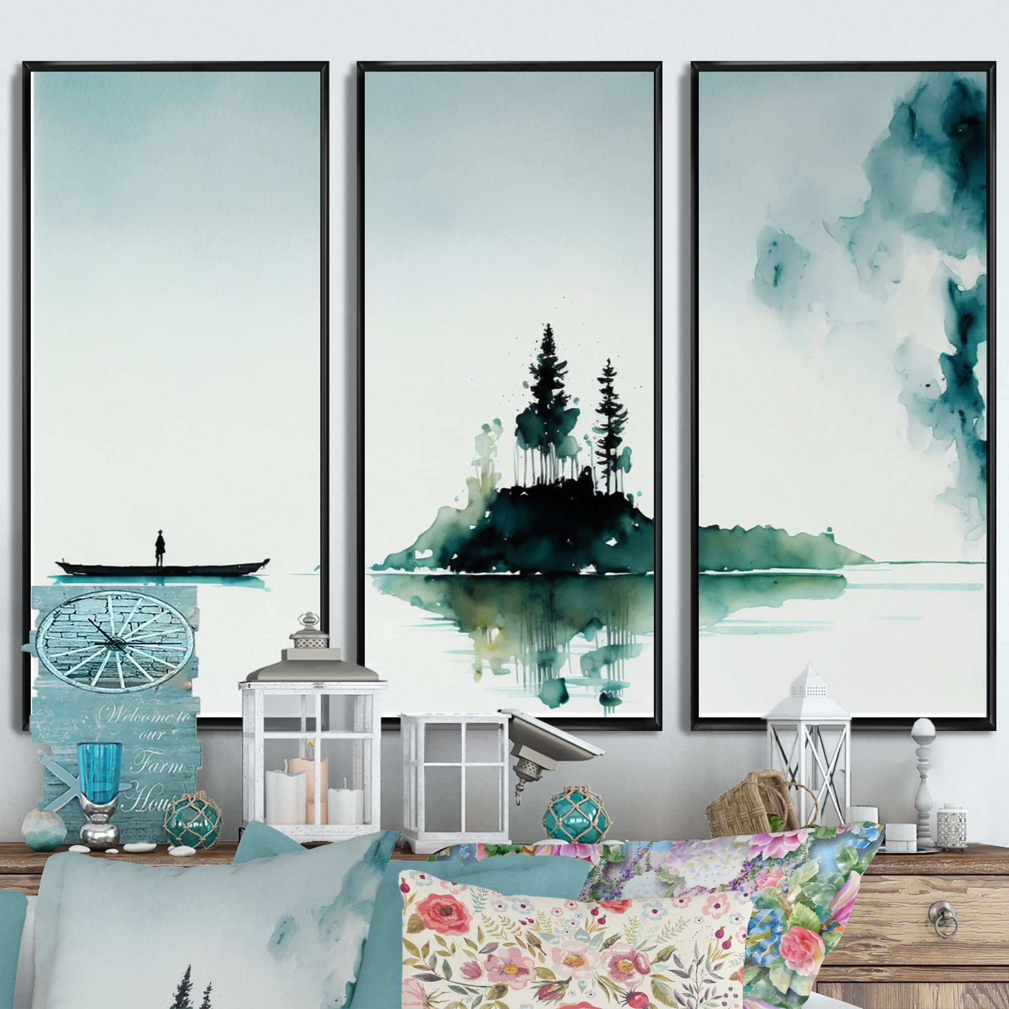 Designart "Little Boat By the Spanish Moss Island" Landscape Forest Framed Canvas Wall Art Print - 3 Panels