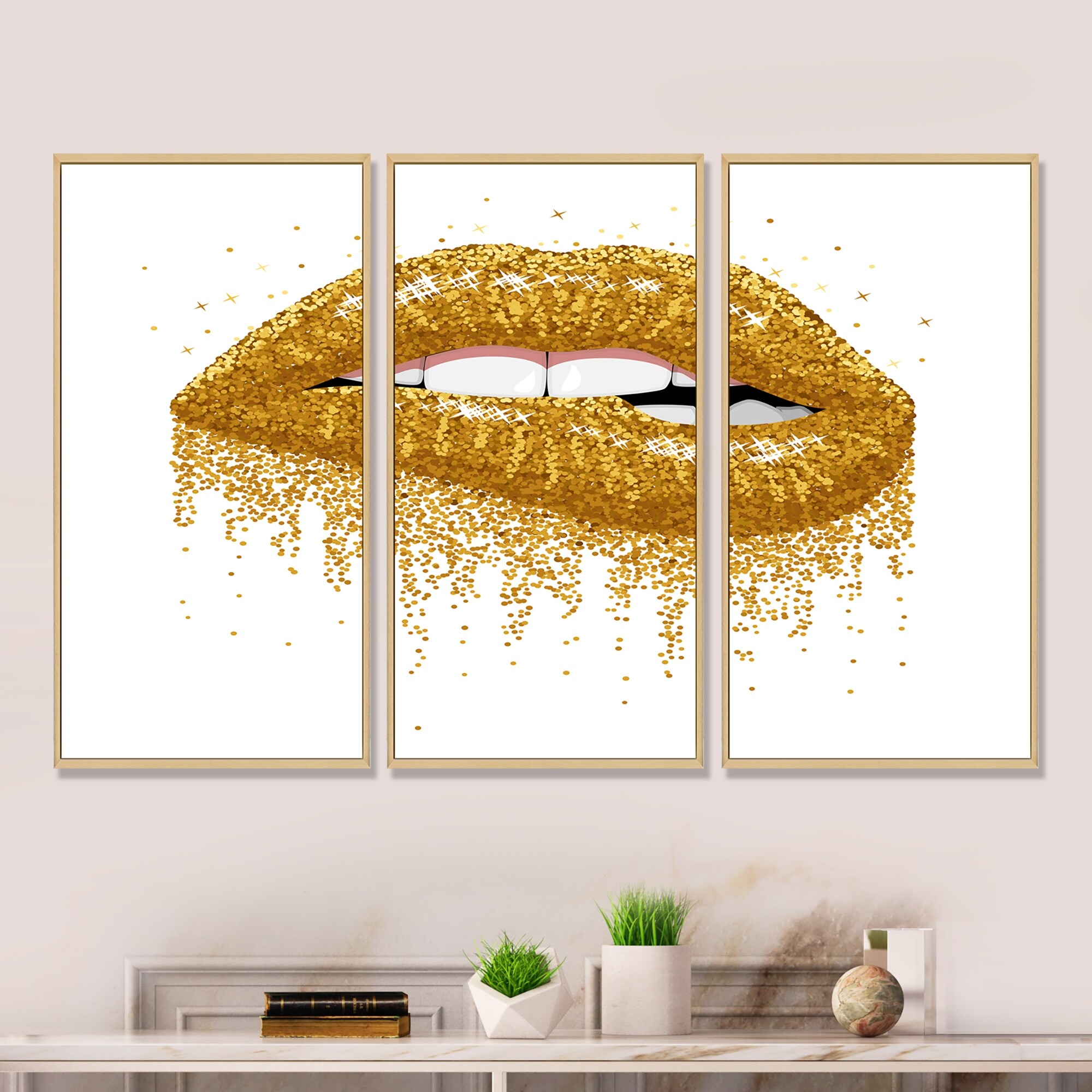 Designart "Woman Lips With Glitter Gold Sparkles" Modern Framed Canvas Wall Art Print Set of 3 - 4 Colors of Frames