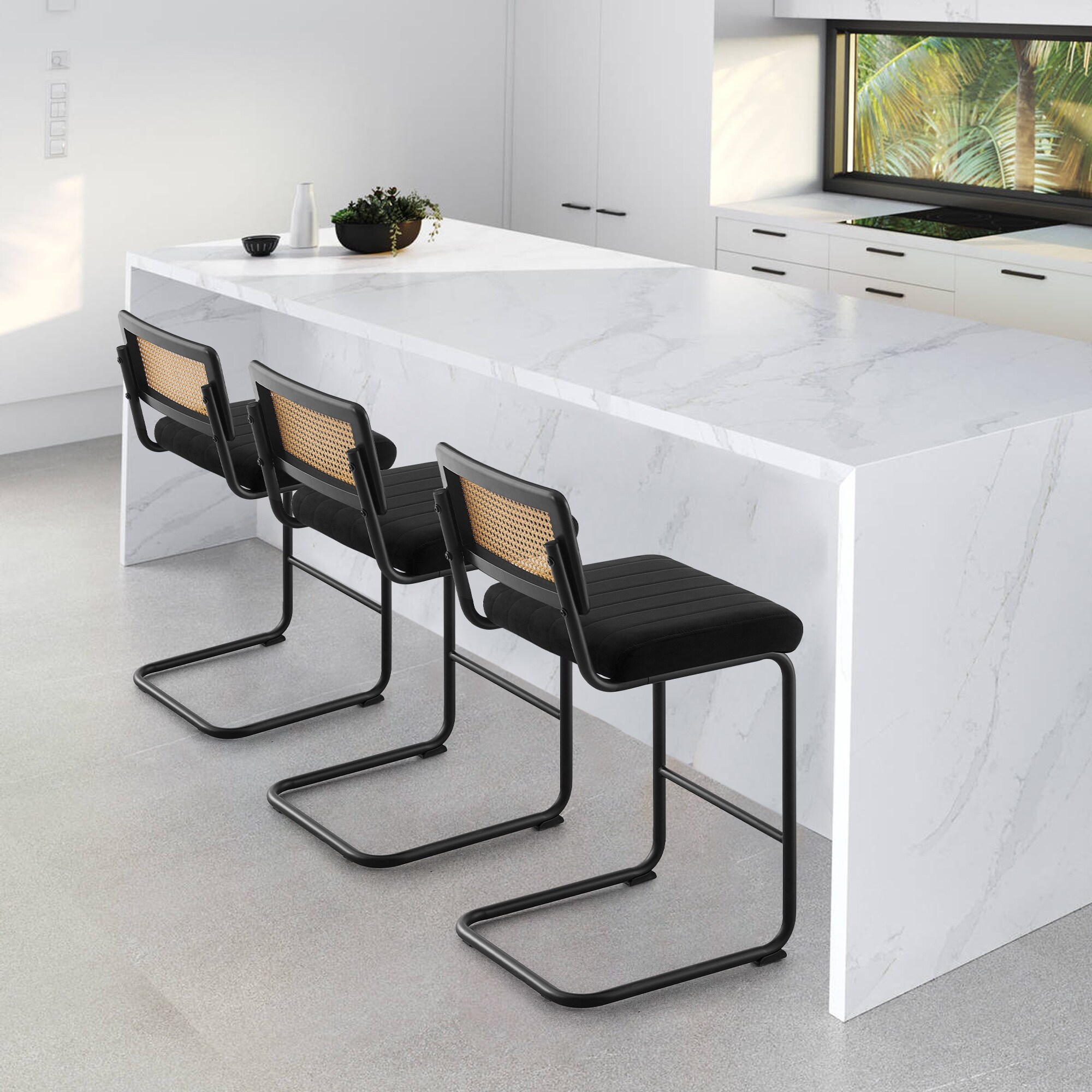 Velvet Upholstered Bar/Counter Stools with Rattan Backrest