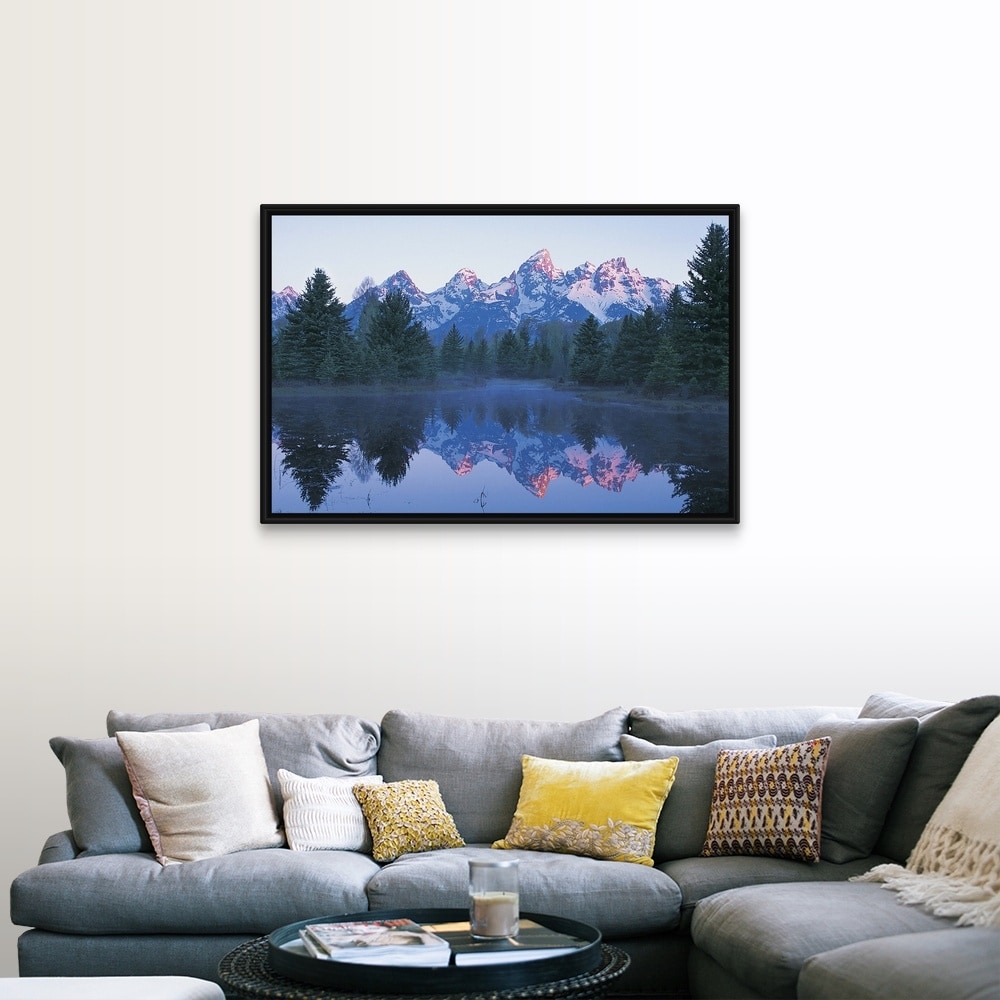 Grand Teton Mountain Range Reflected in a Lake at Sunrise, Wyoming Black Float Frame Canvas Art
