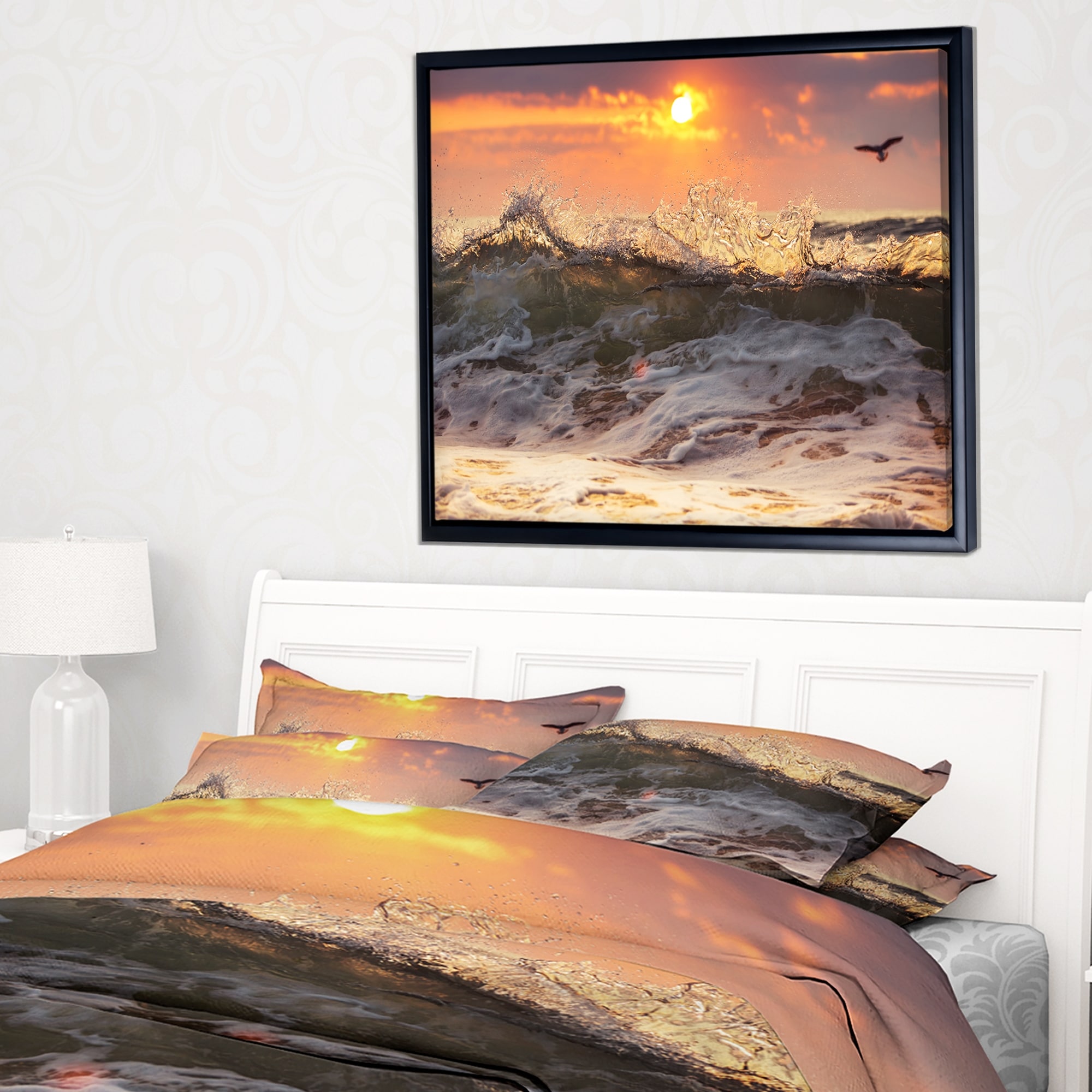 Designart "Sunrise and Roaring Ocean Waves" Seascape Framed Canvas Art Print