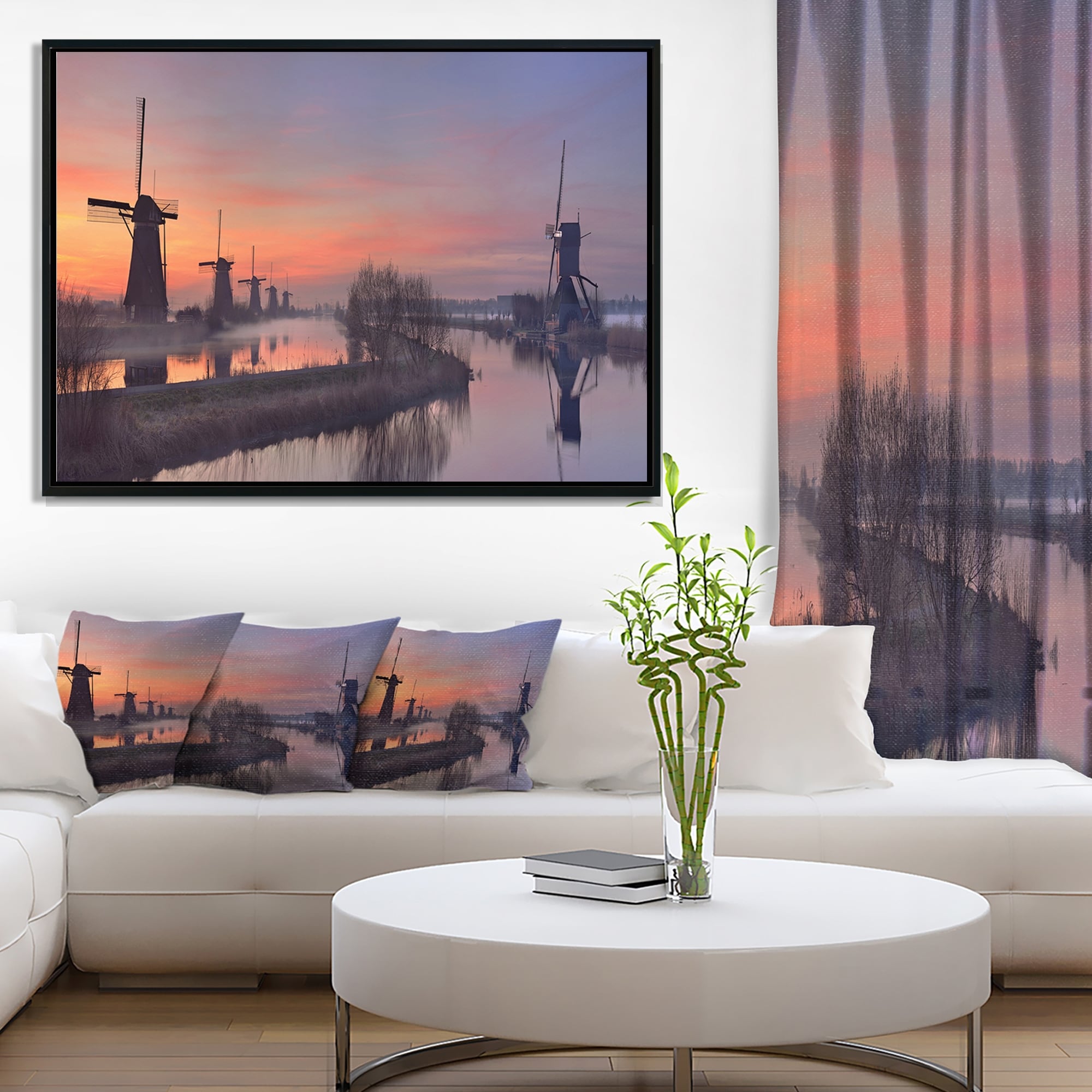 Designart "Windmills at Sunrise Panorama" Landscape Framed Canvas Art Print