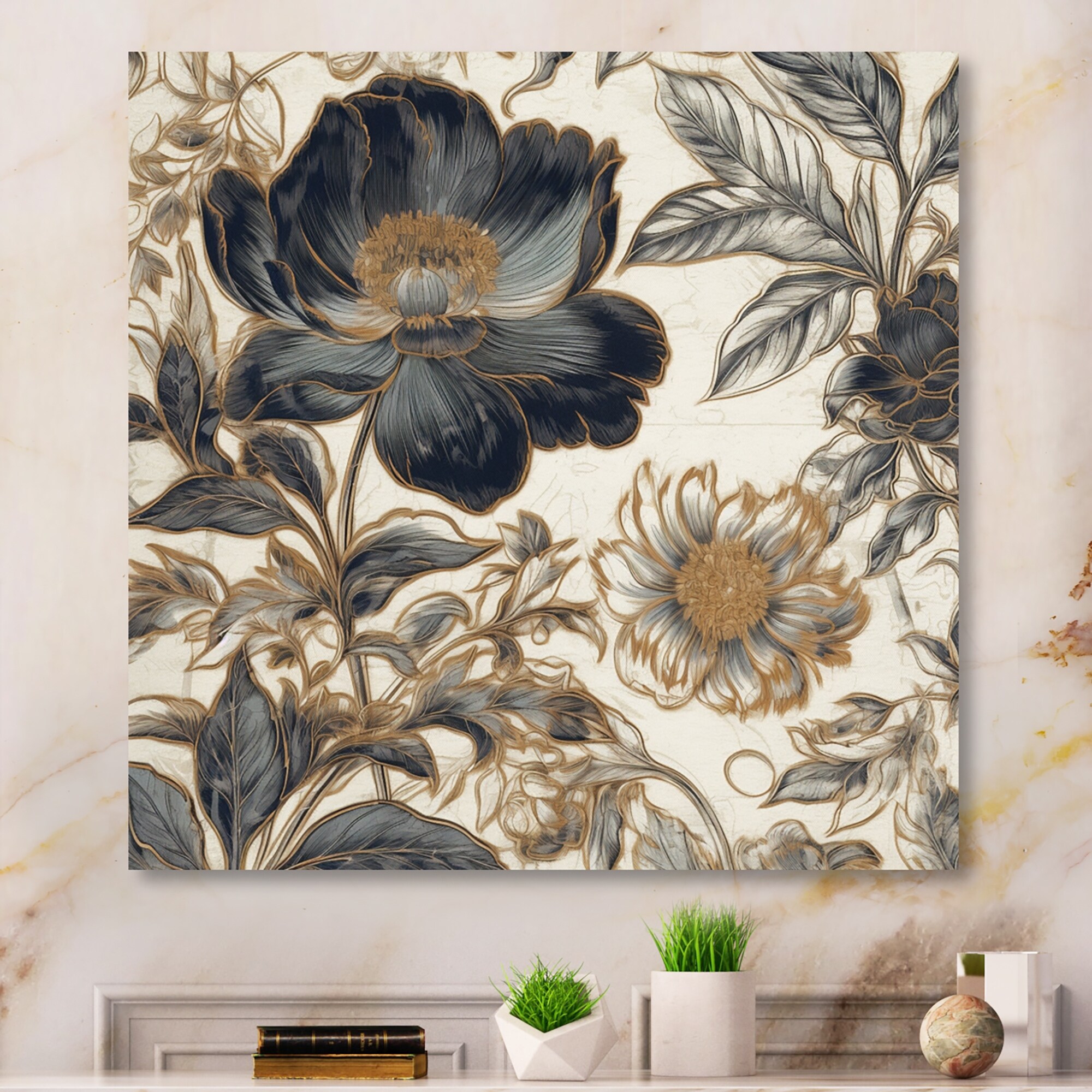 Designart "Blue Gold Peonies Symphony I" Floral Peony Metal Wall Art