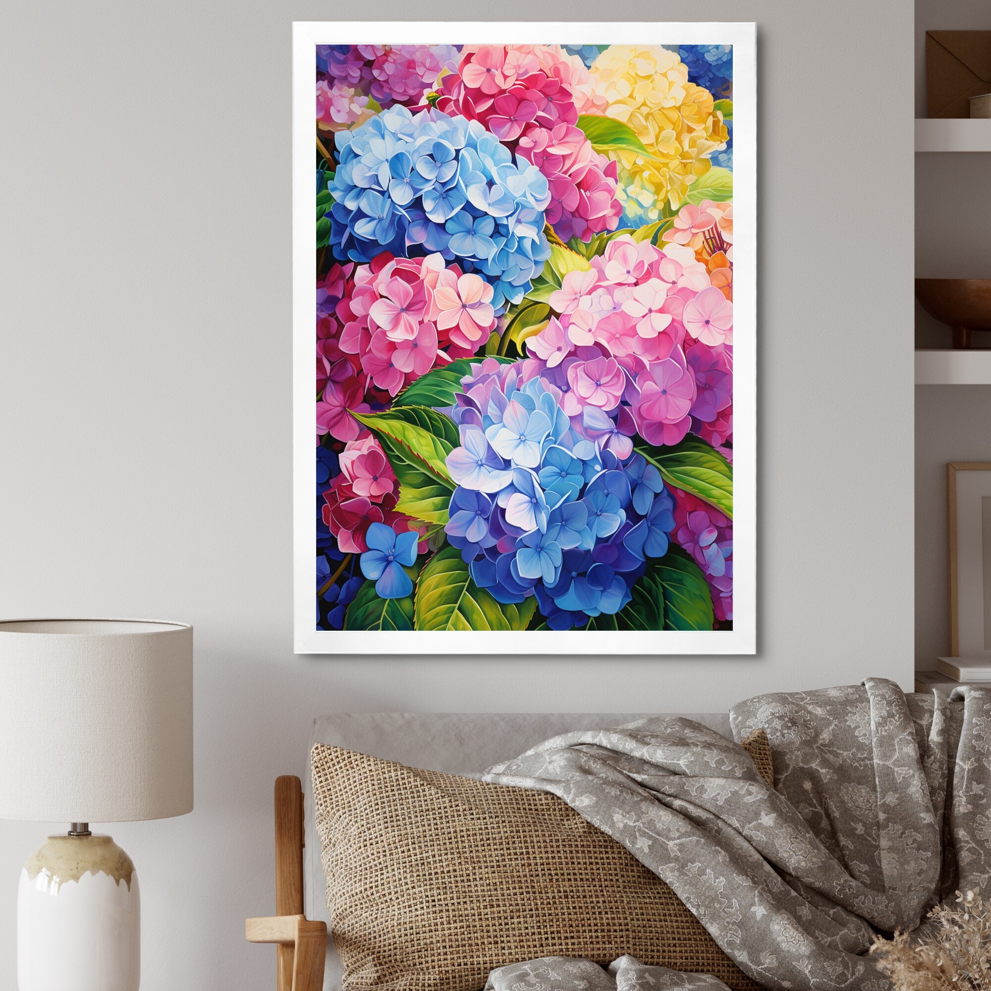 Designart "Pink Blue Hydrangea Garden Symphony" Hydrangea Framed Wall Art Living Room