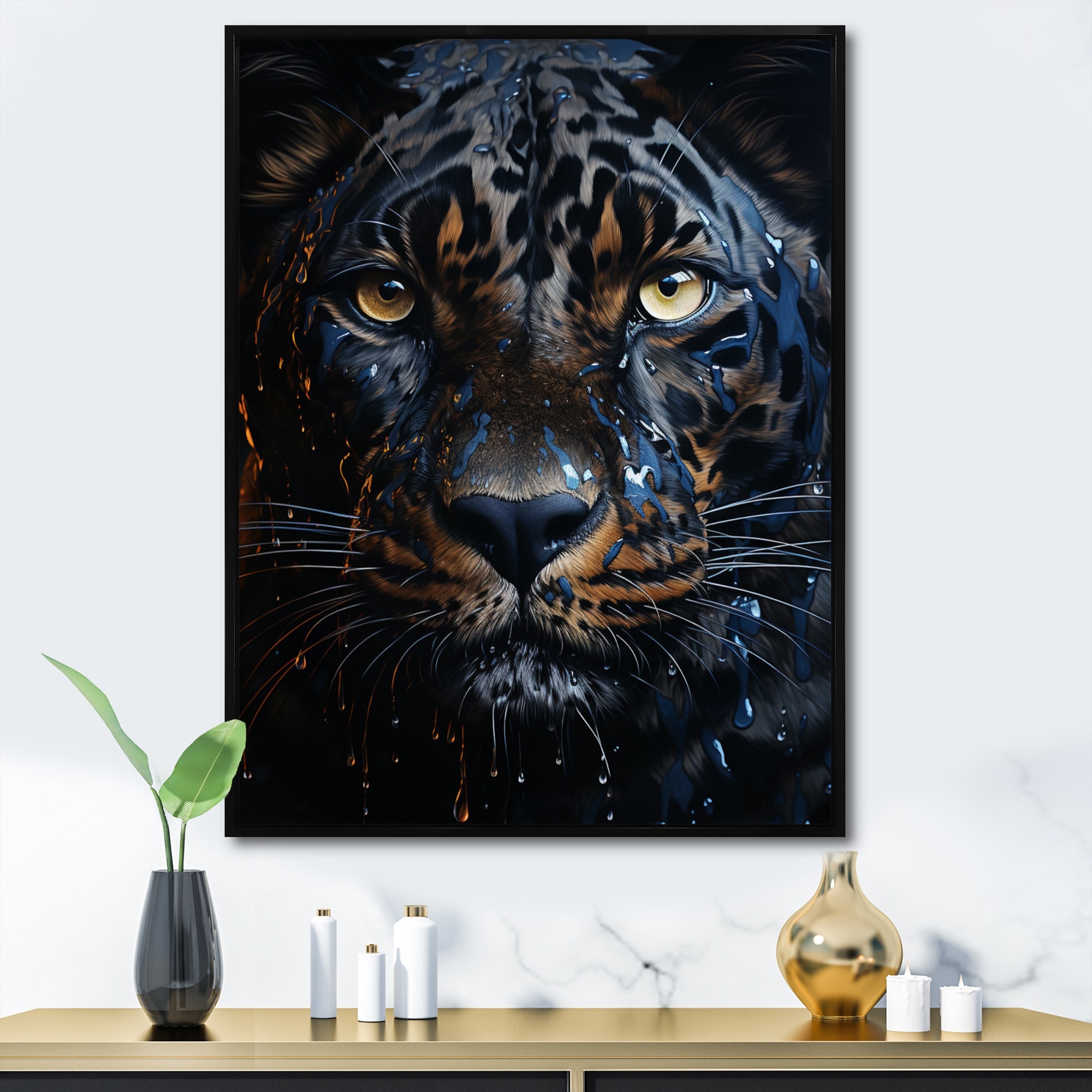 Designart "Teal Yellow Midnight Panther Inky I" Animals Panther Framed Canvas Art Print
