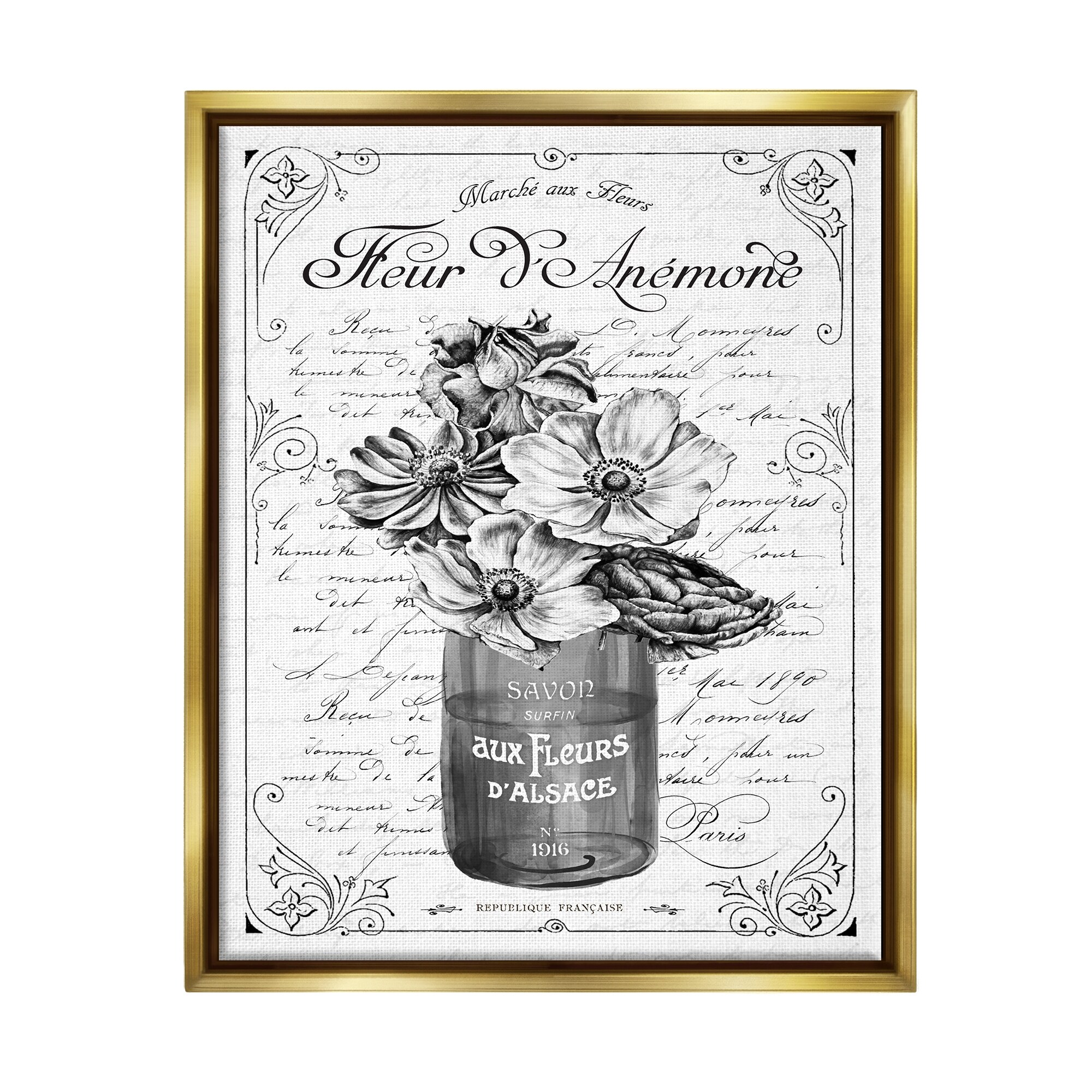 Stupell Anemone Flower French Text Fancy Floral Border Floater Frame, Design by Lettered and Lined