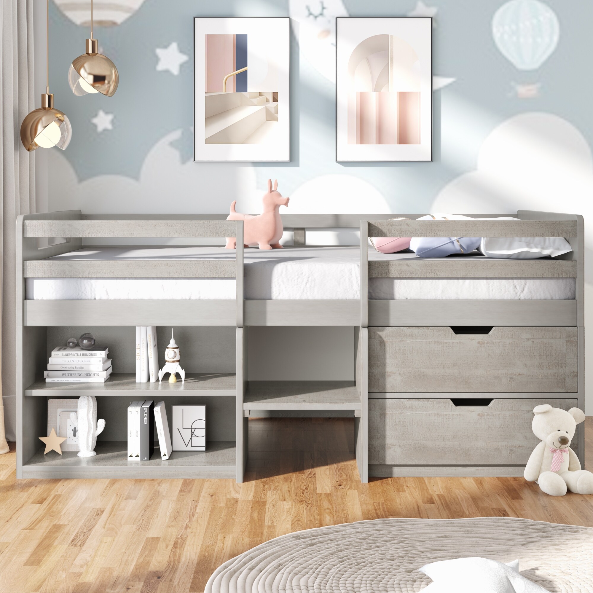 Twin size Loft Bed with Shelves and Desk, Wooden Loft Bed with Desk - Gray
