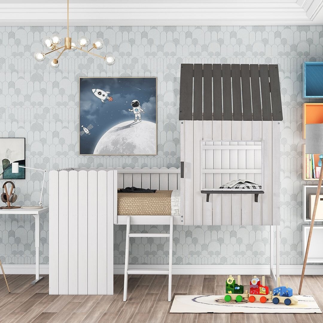 Twin Over Twin Bunk Bed Wood Bed with Roof, Window, Guardrail