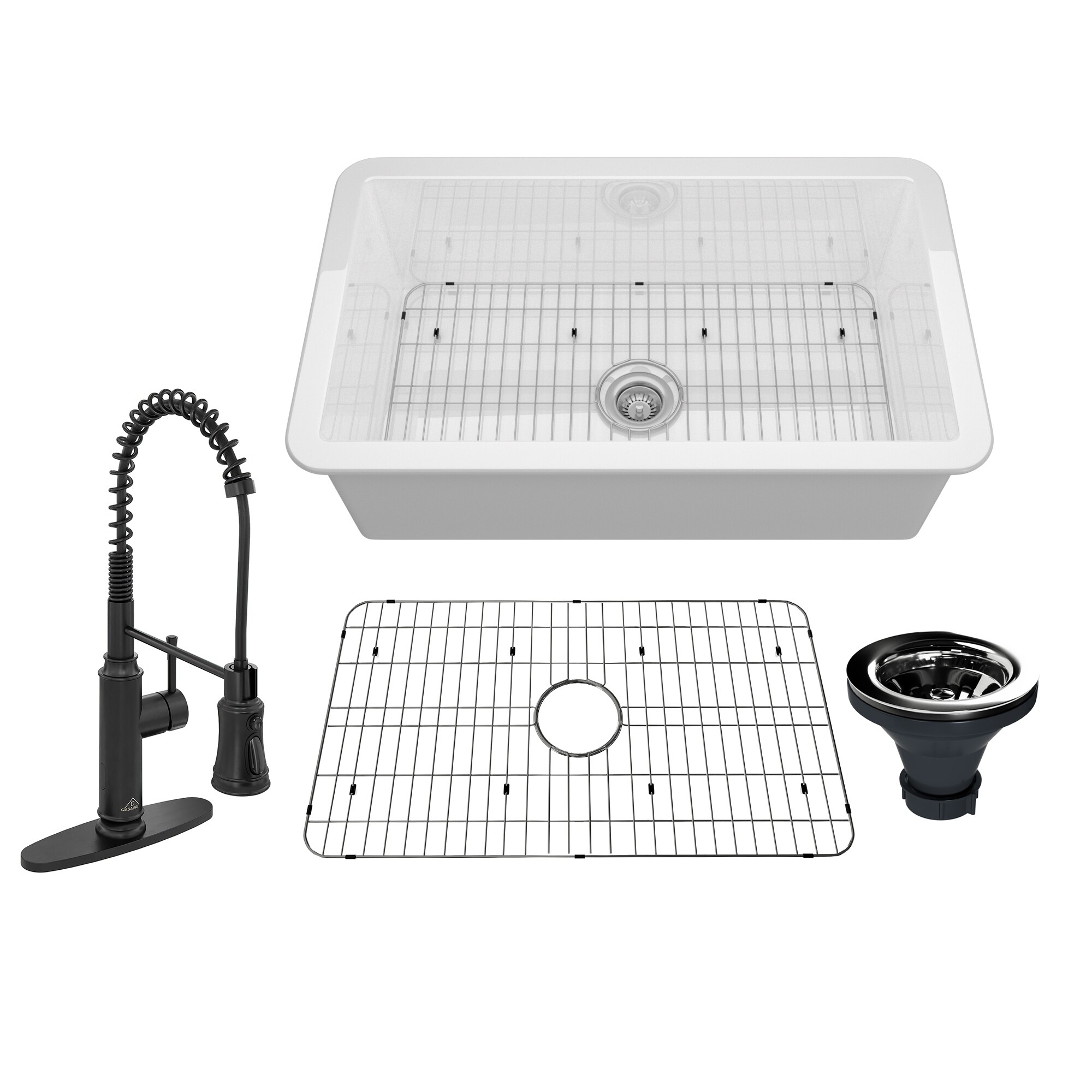 32-in Glossy White Undermount Single Bowl Fireclay Kitchen Sink With Pull Kitchen Faucet