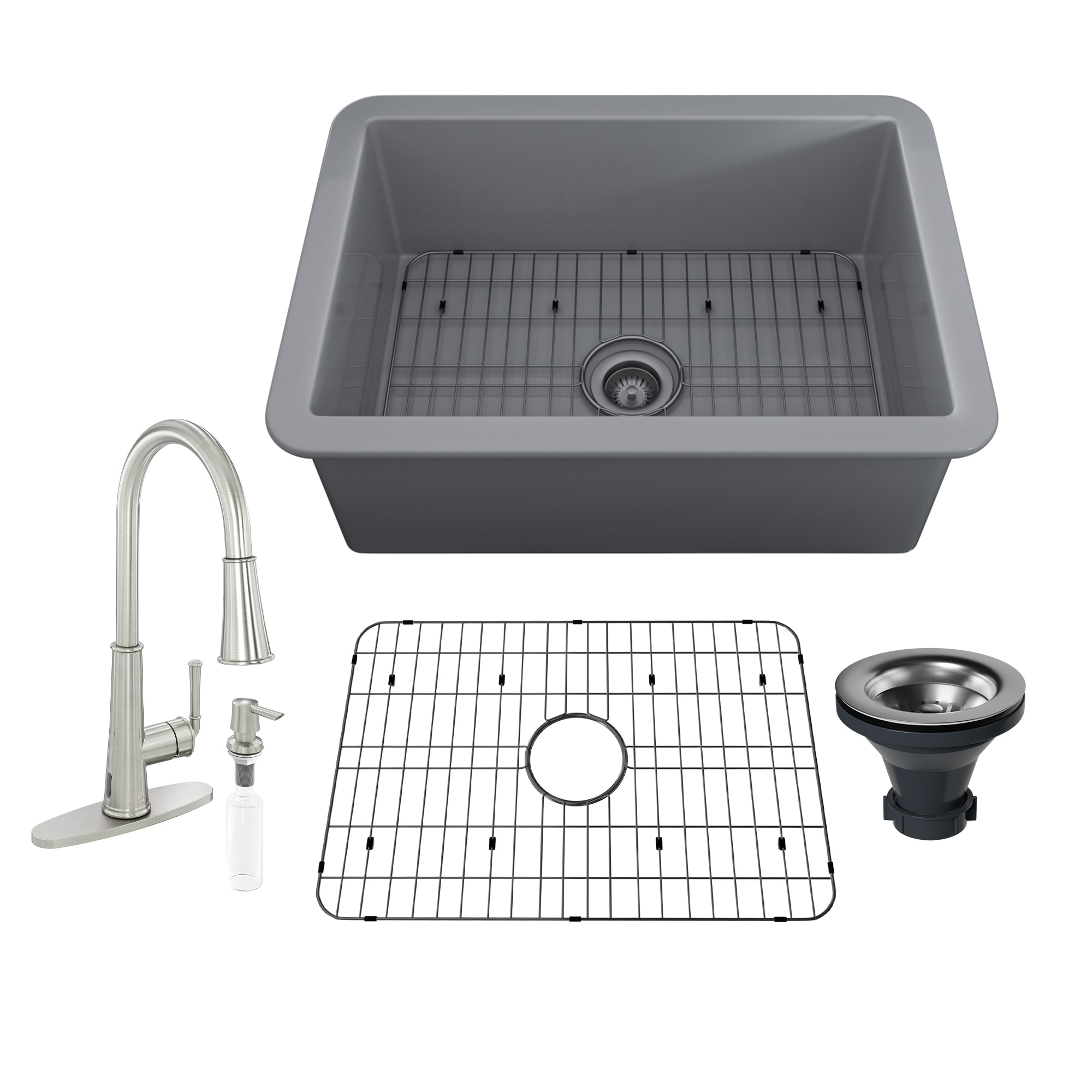 27-in Matte Gray Undermount Single Bowl Fireclay Kitchen Sink With Brushed Nickel Pull-out Faucet