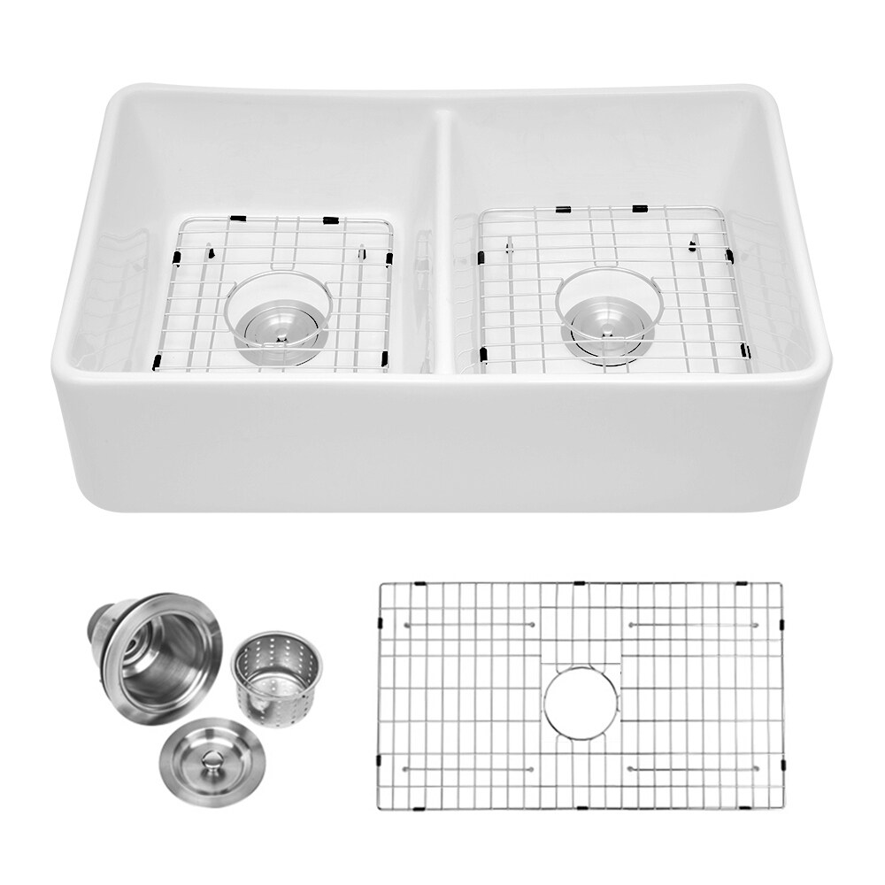 Fireclay Double Basin Farmhouse Kitchen Sink With Grid And Strainer