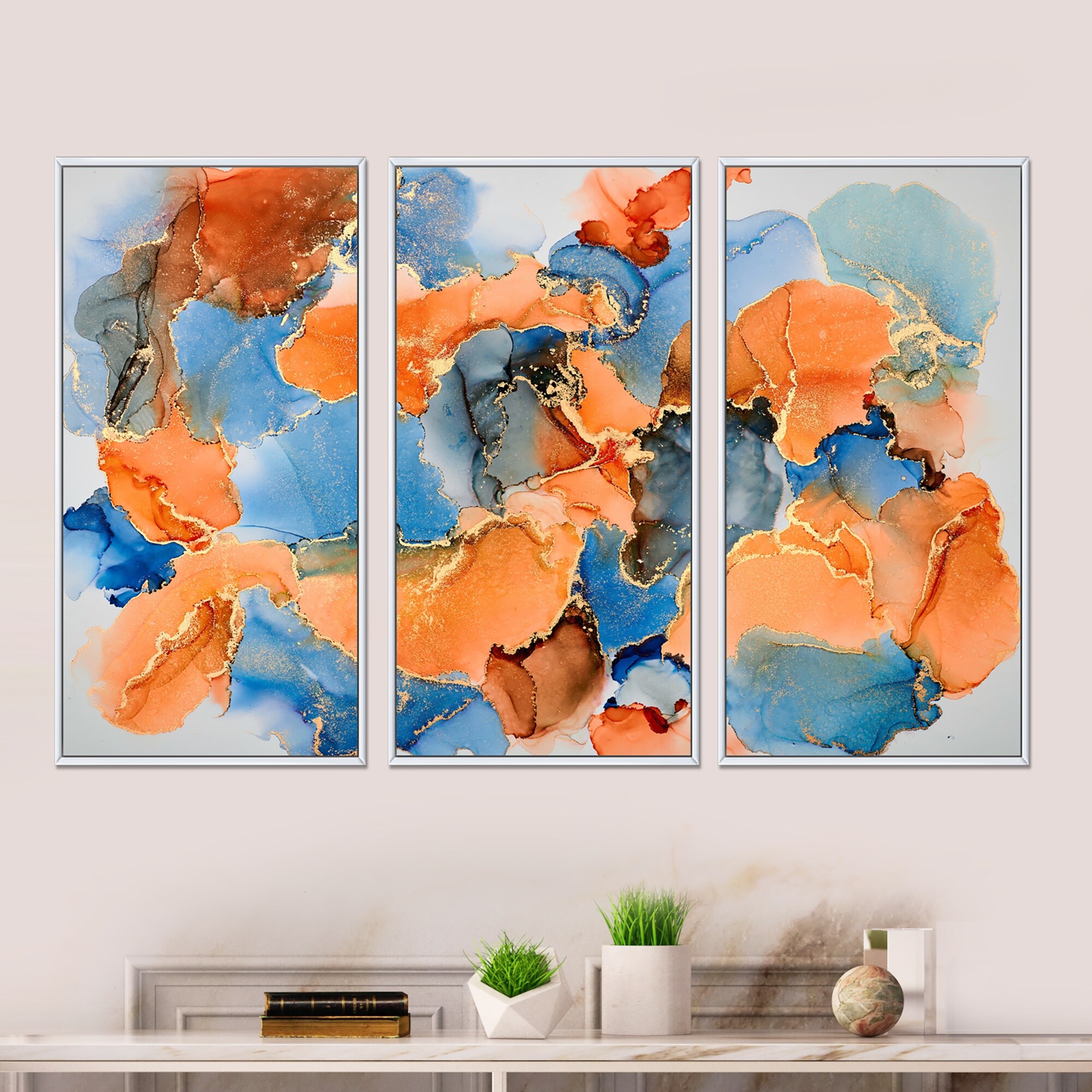 Designart "Blue And Brown Luxury Abstract Fluid Art VII" Modern Framed Art Set of 3 - 4 Colors of Frames