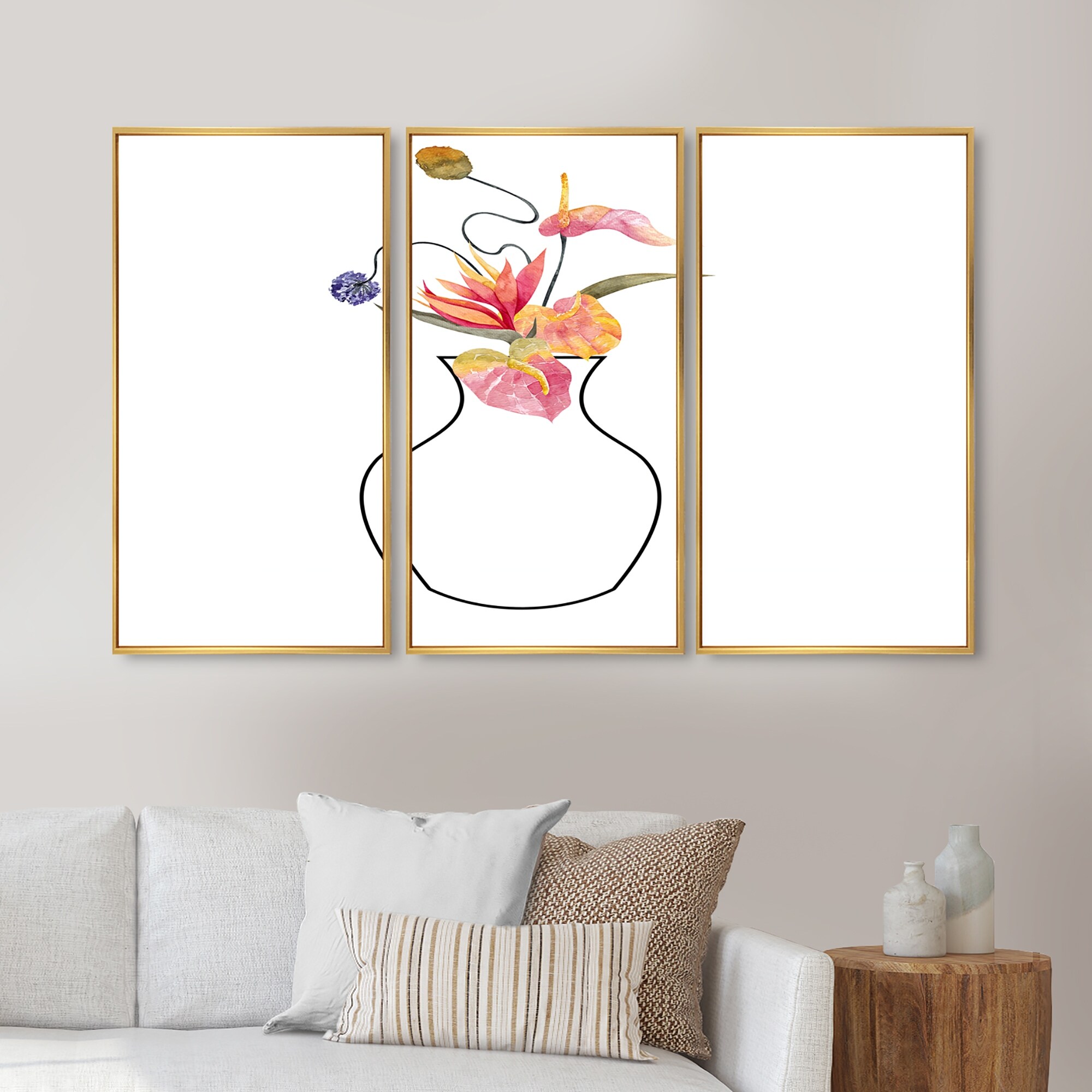 Designart "Composition With Minimalistic Floral Bouquet VII" Casual Framed Canvas Wall Art Set of 3 - 4 Colors of Frames