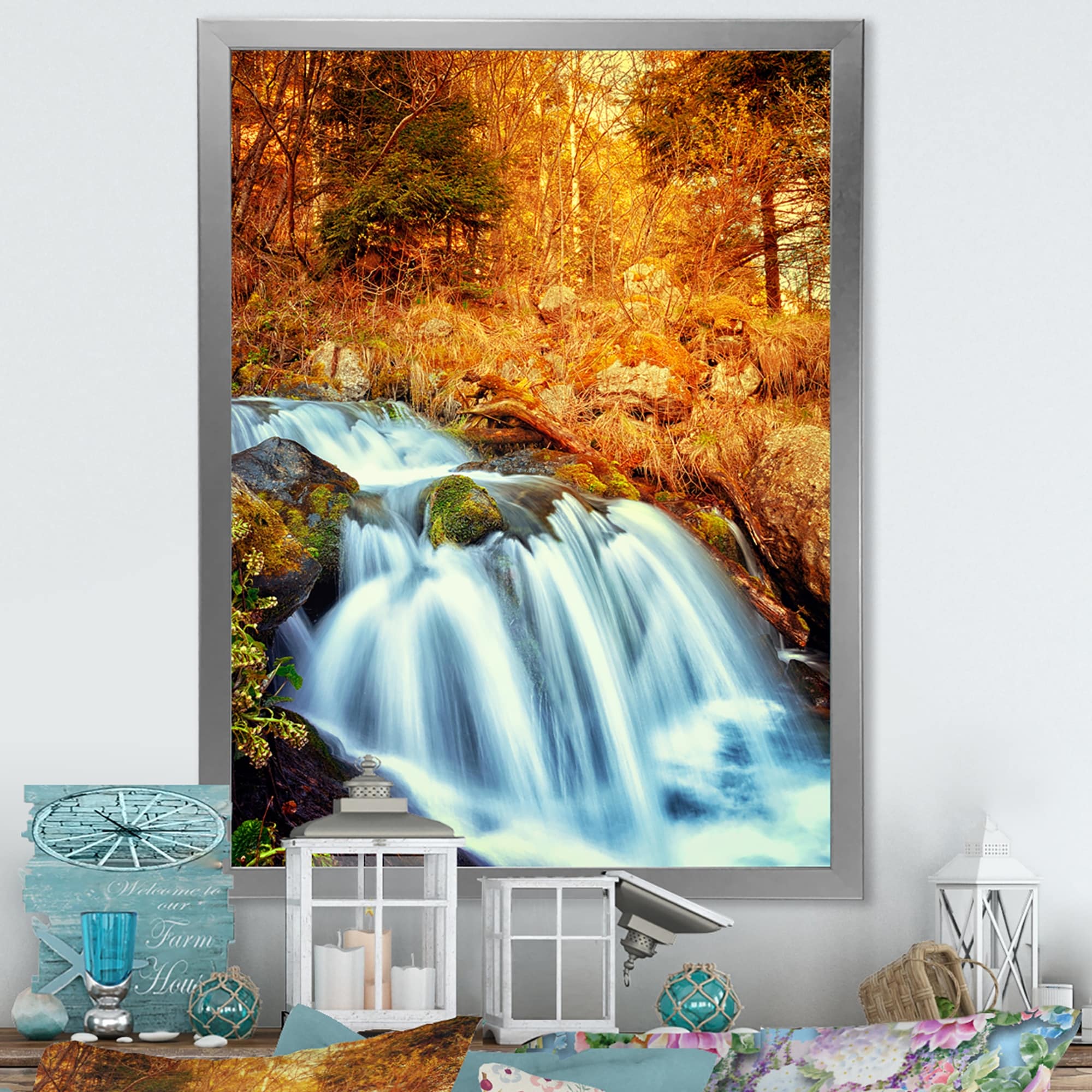 Designart "Beautiful Autumn Forest Waterfall VII" Traditional Framed Art Print