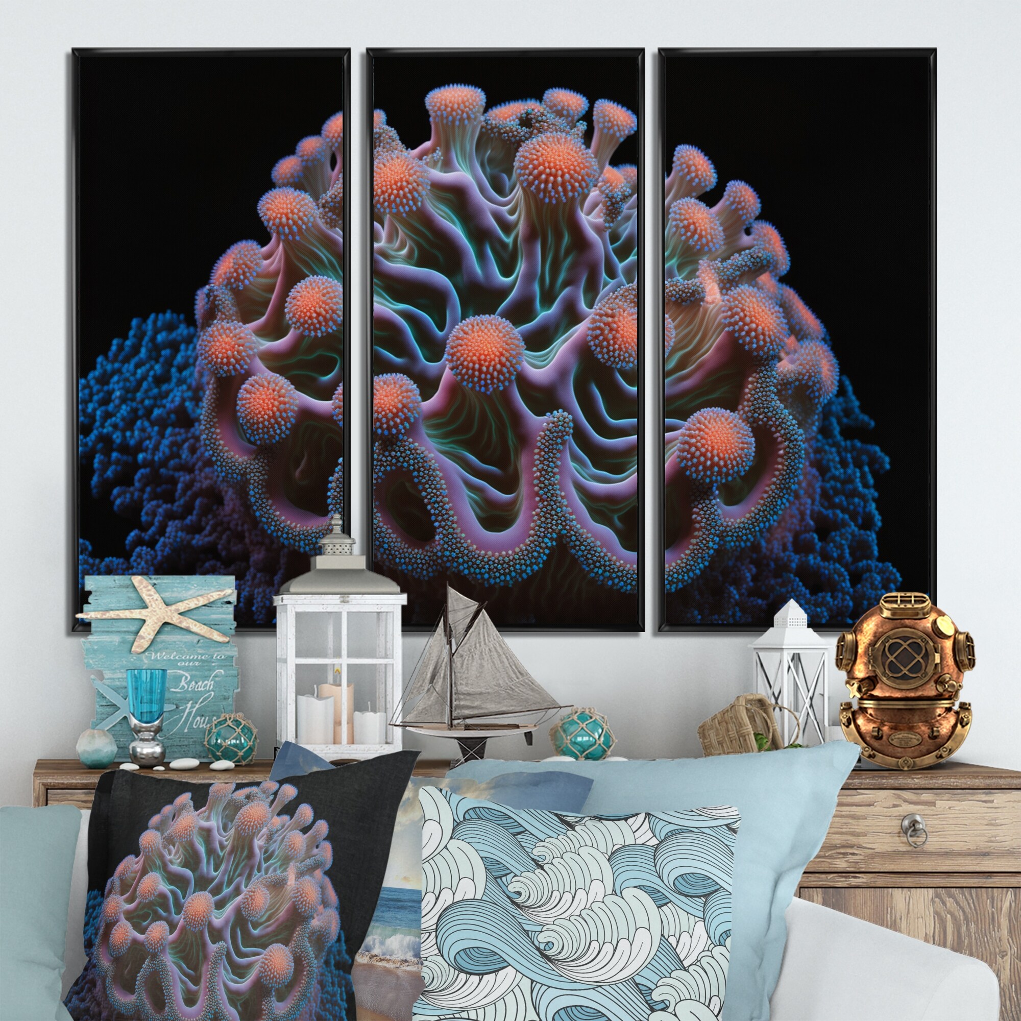 Designart "Colorful Hyperbolic Deep Sea Coral VII" Coastal Framed Canvas Wall Art Print - 3 Panels