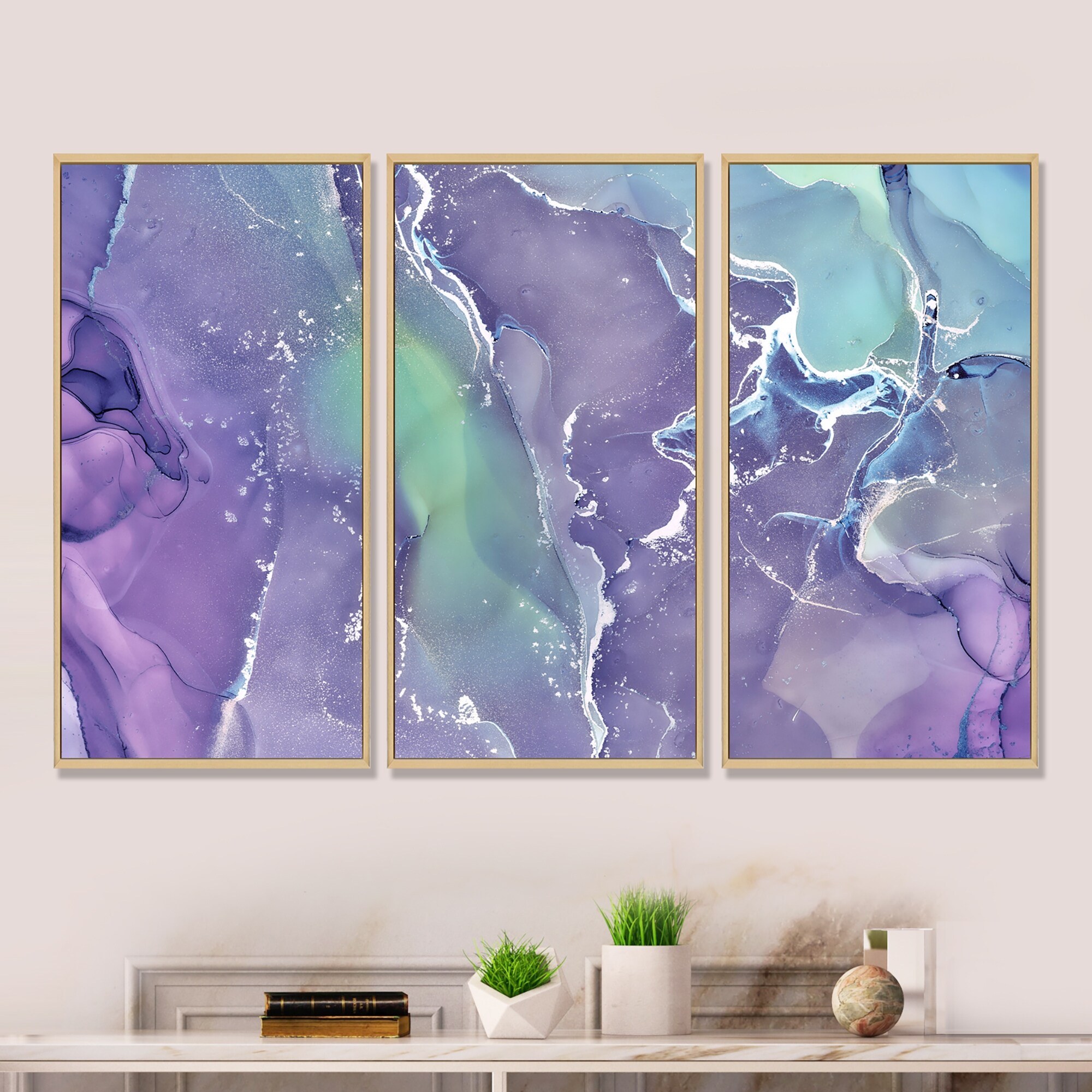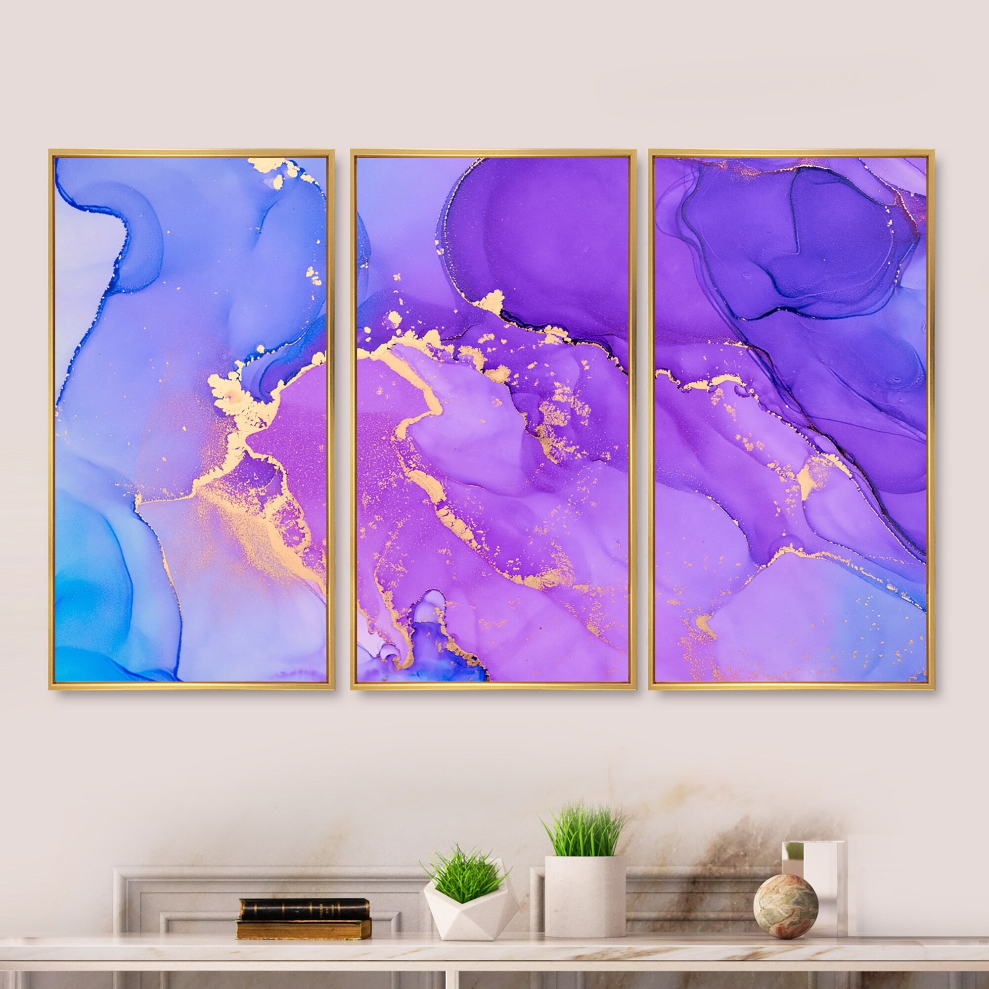 Designart "Purple And Blue Luxury Abstract Fluid Art VII" Modern Framed Artwork Set of 3 - 4 Colors of Frames