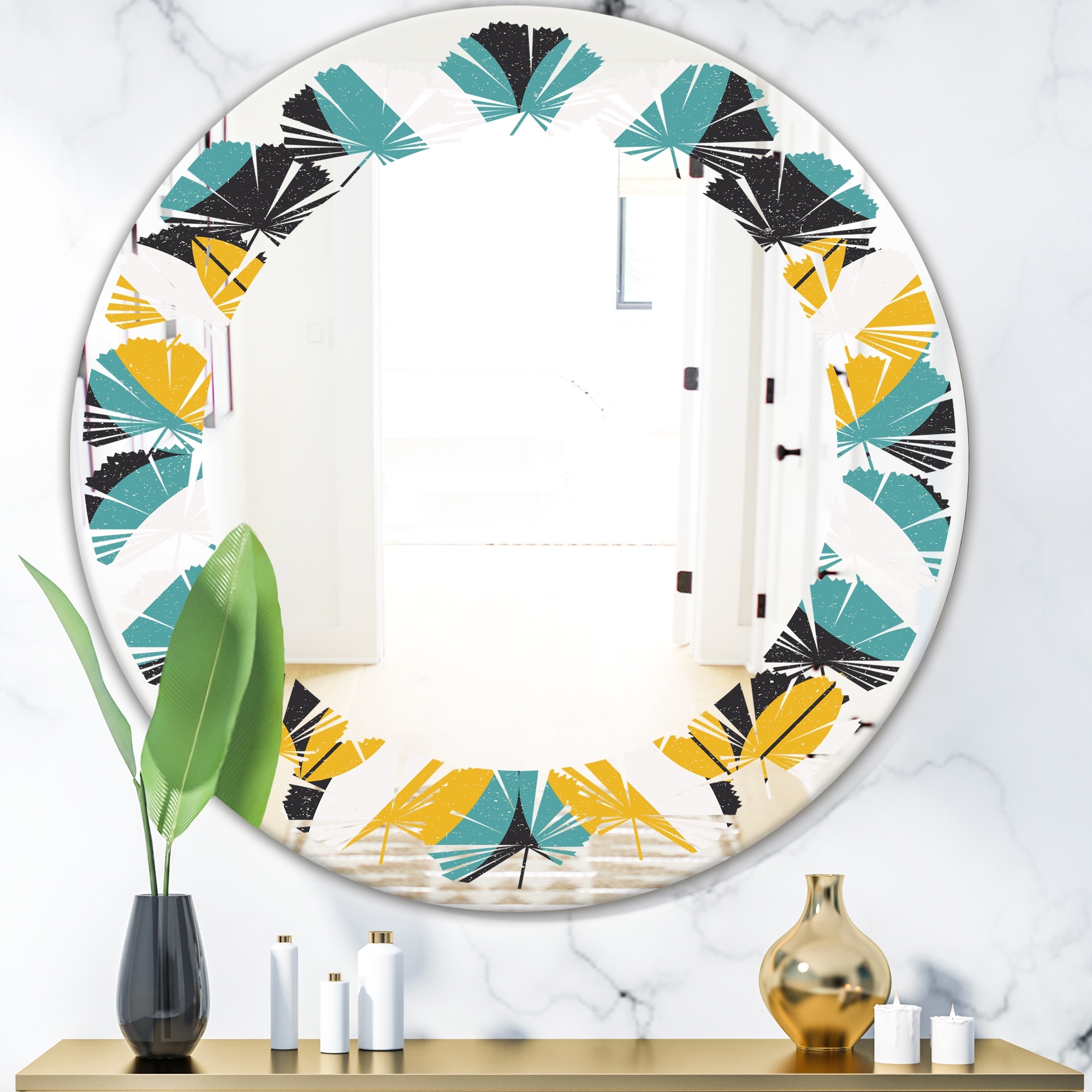 Designart 'Retro Abstract Design VII' Printed Modern Round or Oval Wall Mirror - Leaves