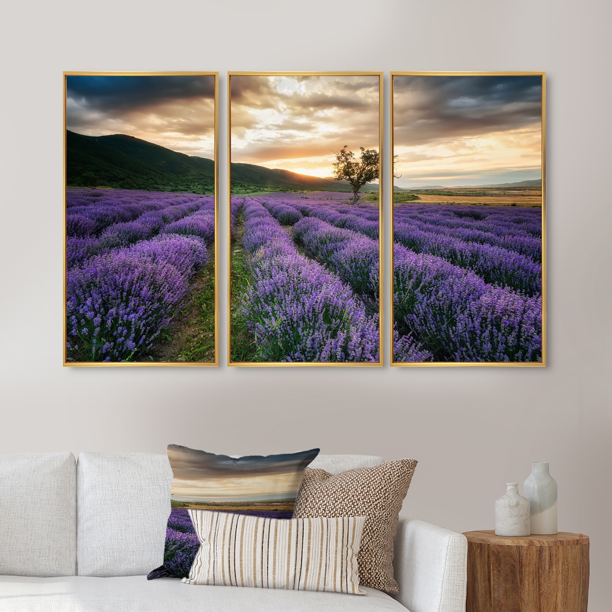 Designart "Sunrise & Dramatic Clouds Over Lavender Field VII" Farmhouse Framed Artwork Set of 3 - 4 Colors of Frames