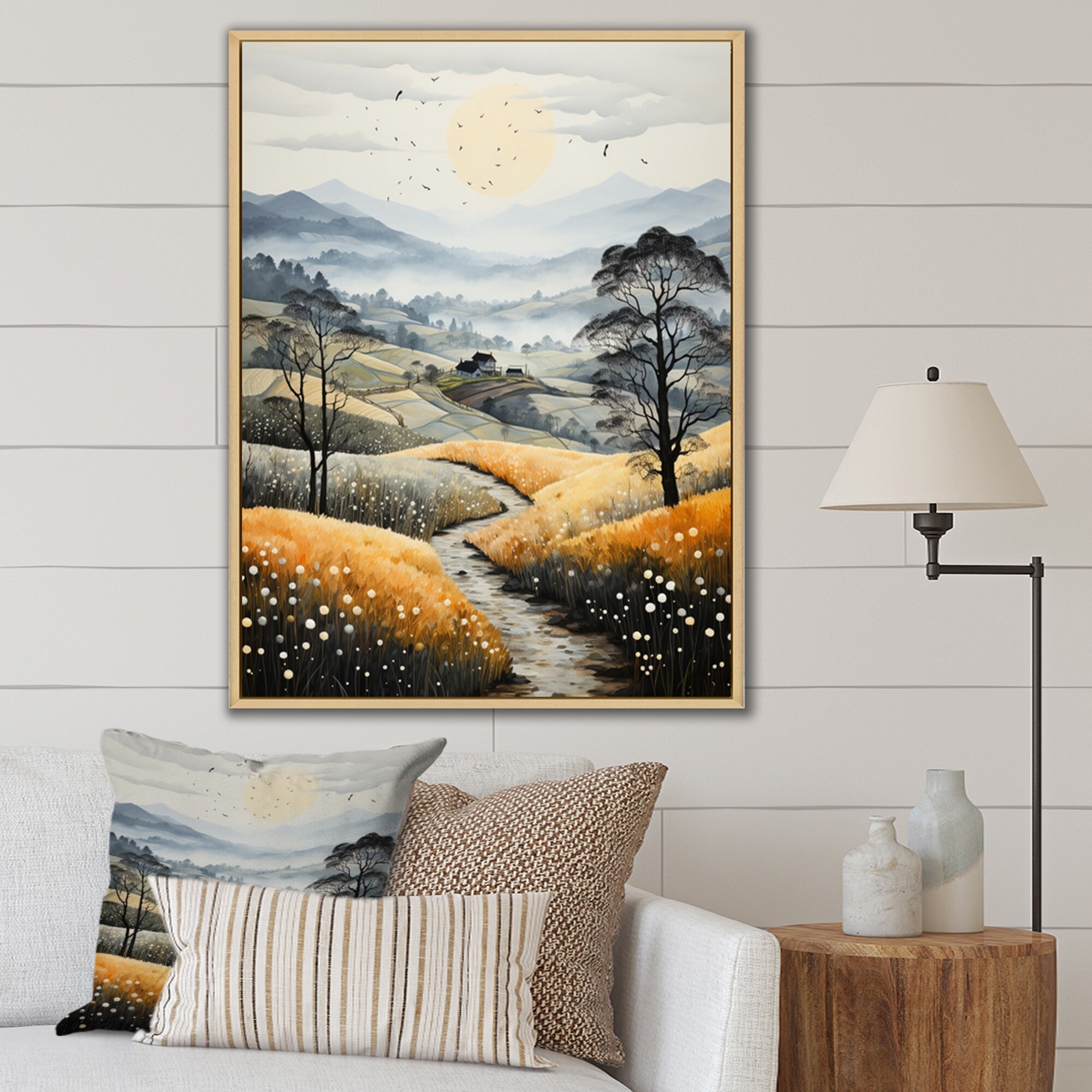 Designart "Countryside Misty Morning Patchwork IV" Countryside Framed Wall Art Living Room