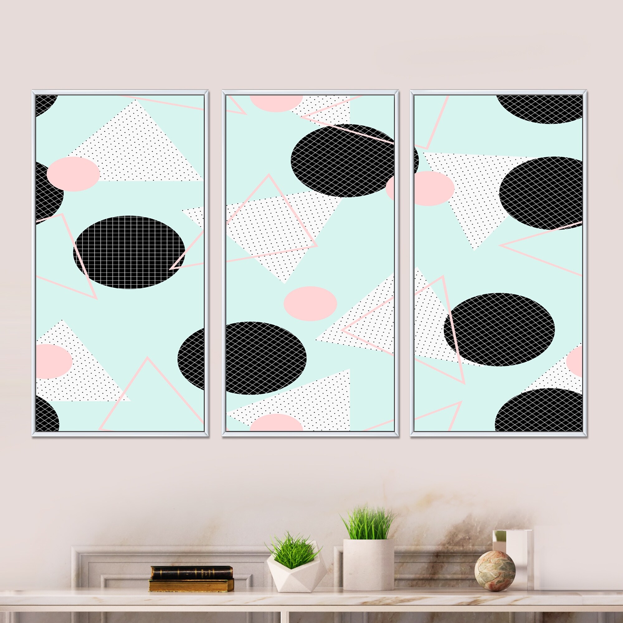 Designart "Black Circlels on Pastel Blue And Pink Geometrics" Modern Framed Canvas Wall Art Set of 3 - 4 Colors of Frames