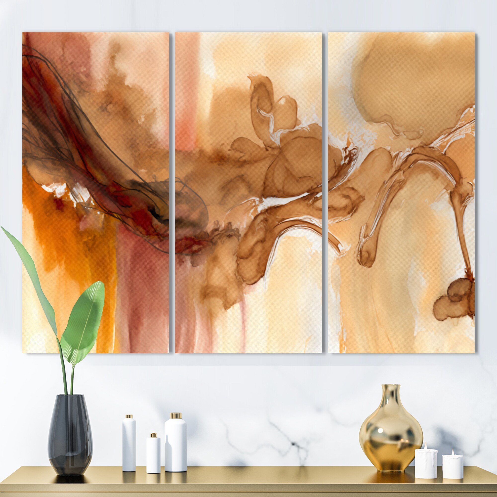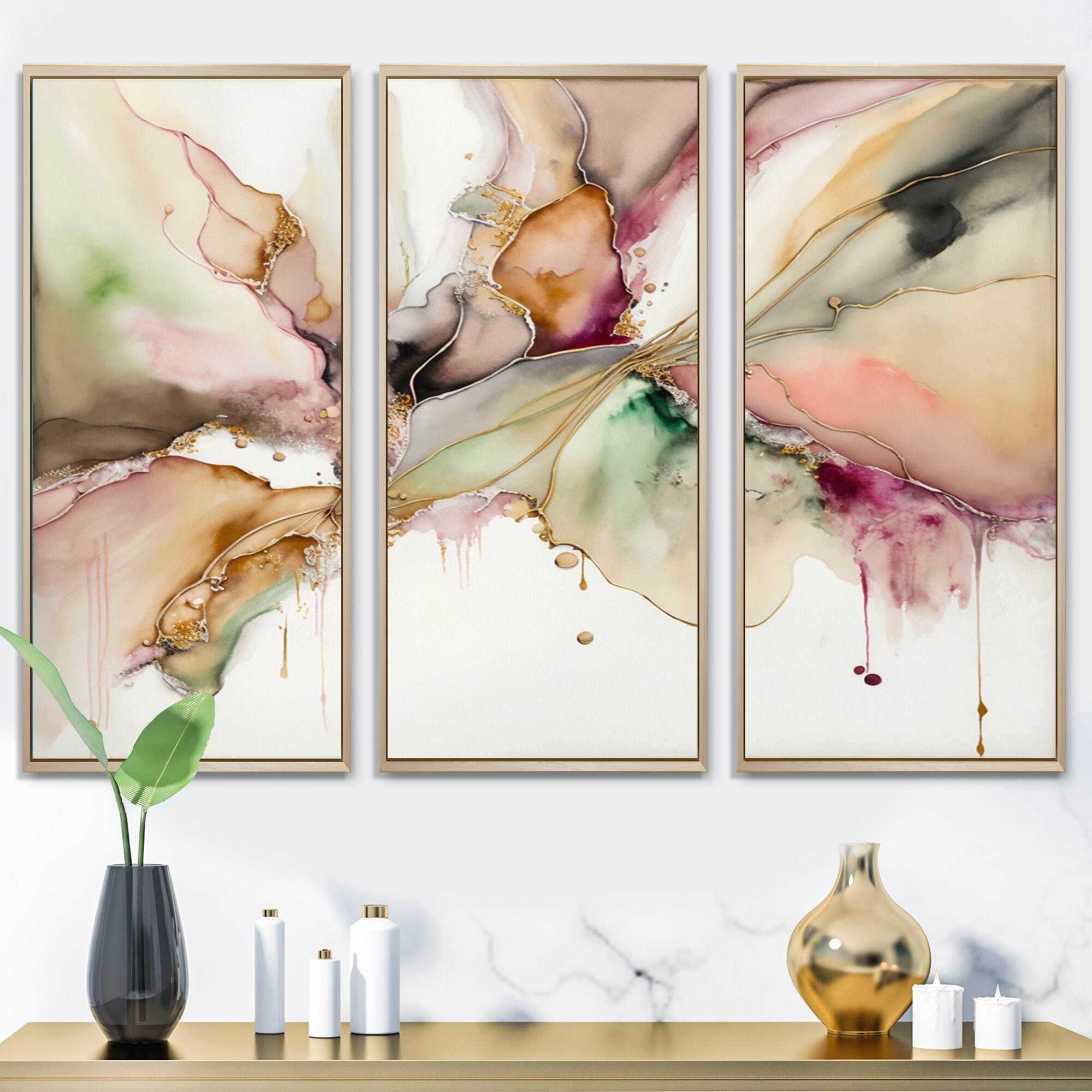 Designart "Liquid Universe With A Touch of Gold IV" Abstract Liquid Ink Framed Canvas Wall Art Print - 3 Panels