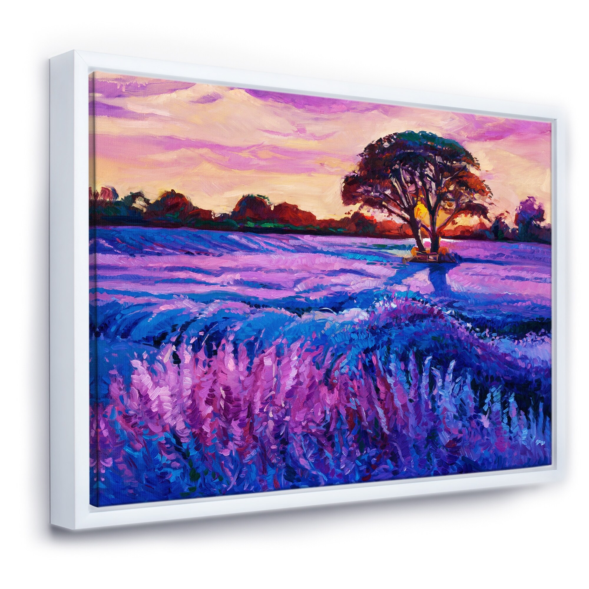 Designart "Lavender Field With Tree During Sunset" Modern & Contemporary Framed Canvas Wall Art Print