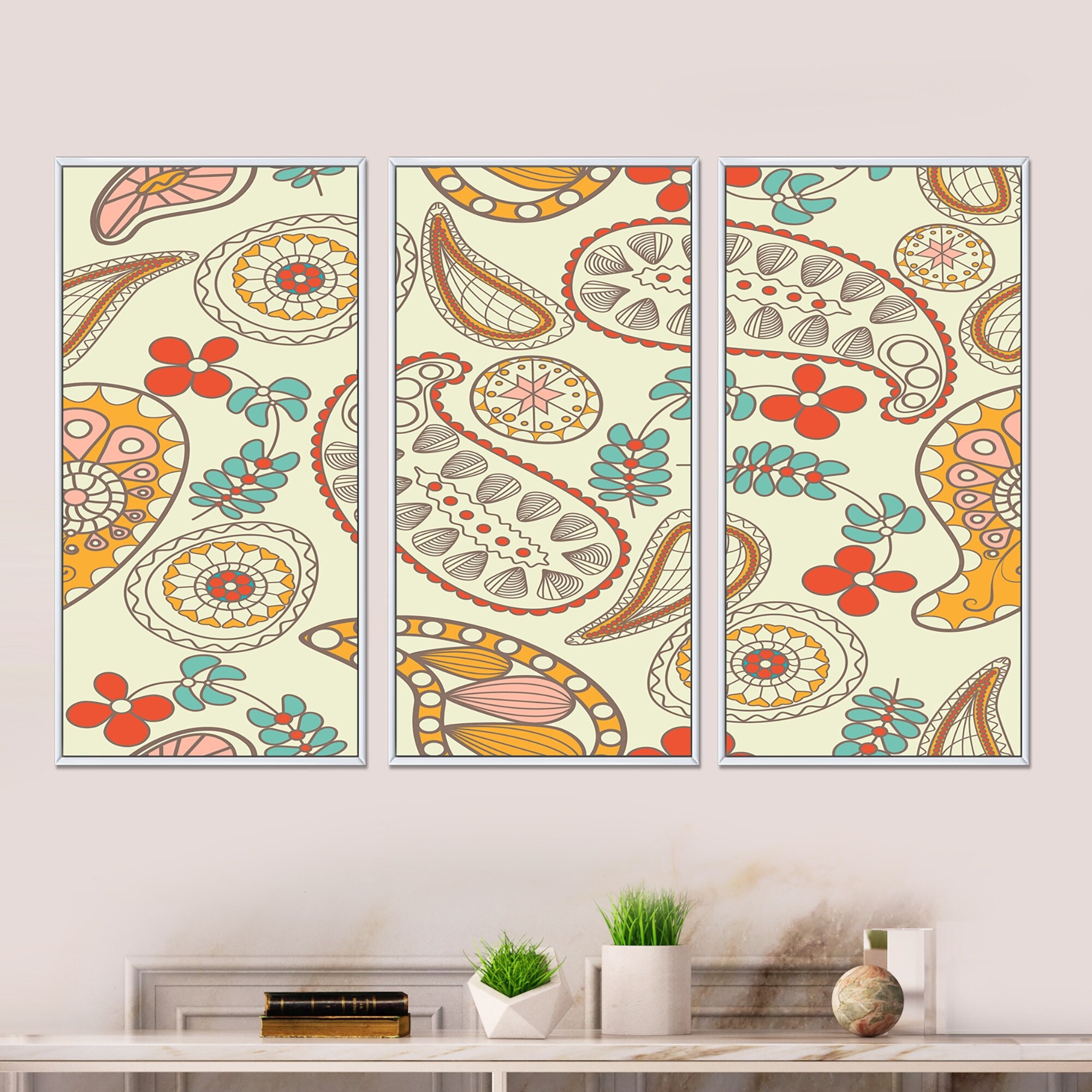 Designart "Paisley Pattern" Vintage Framed Wall Art Set of 3 - 4 Colors of Frames