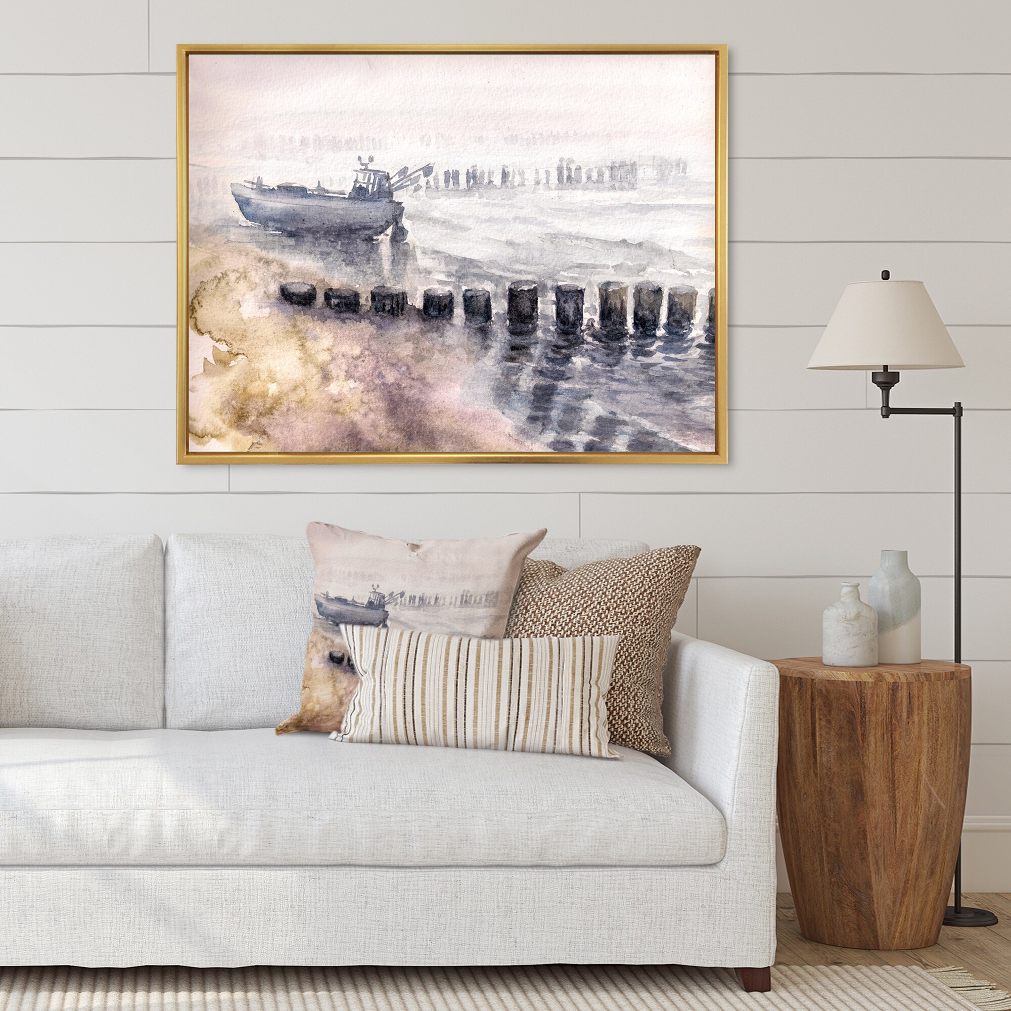 Designart "Fishing Boat in the Harbor" Nautical & Coastal Framed Canvas Wall Art Print