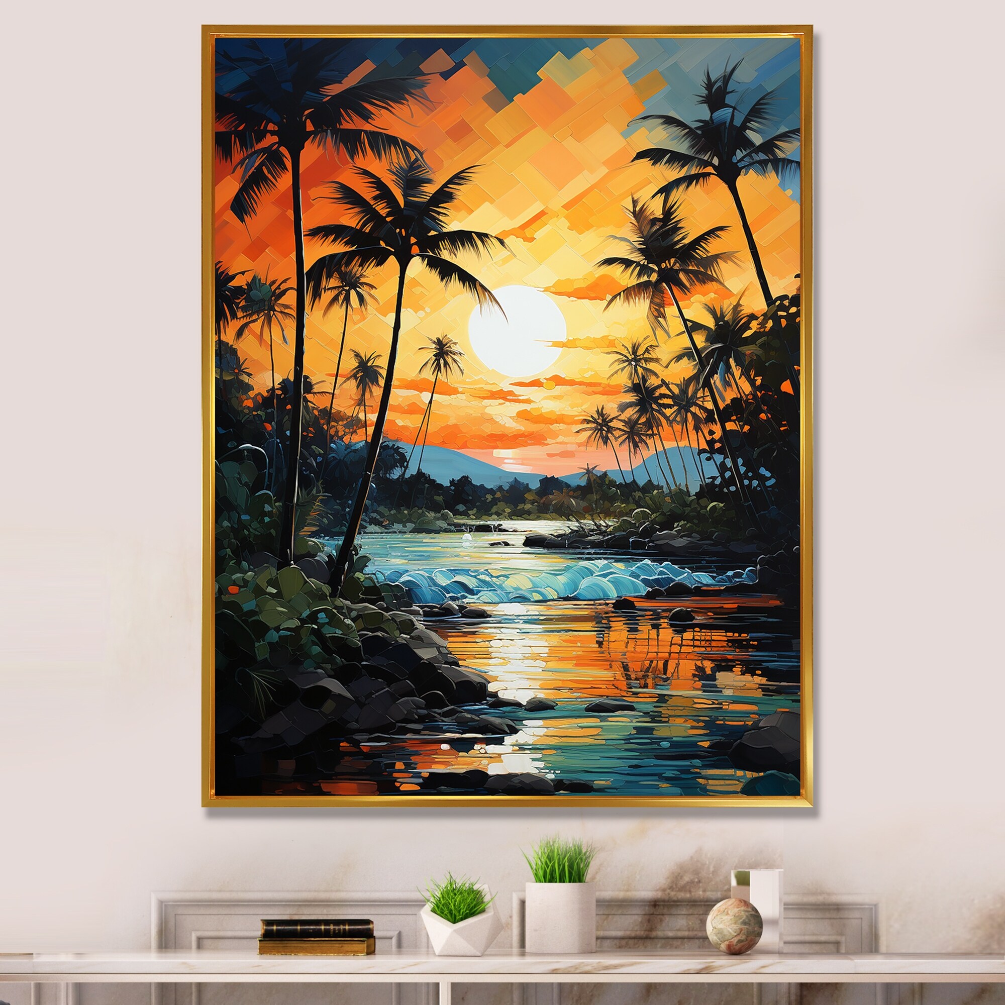 Designart "Palm Trees Tropical Pointillism V" Palms & Palm Trees Framed Wall Art Living Room