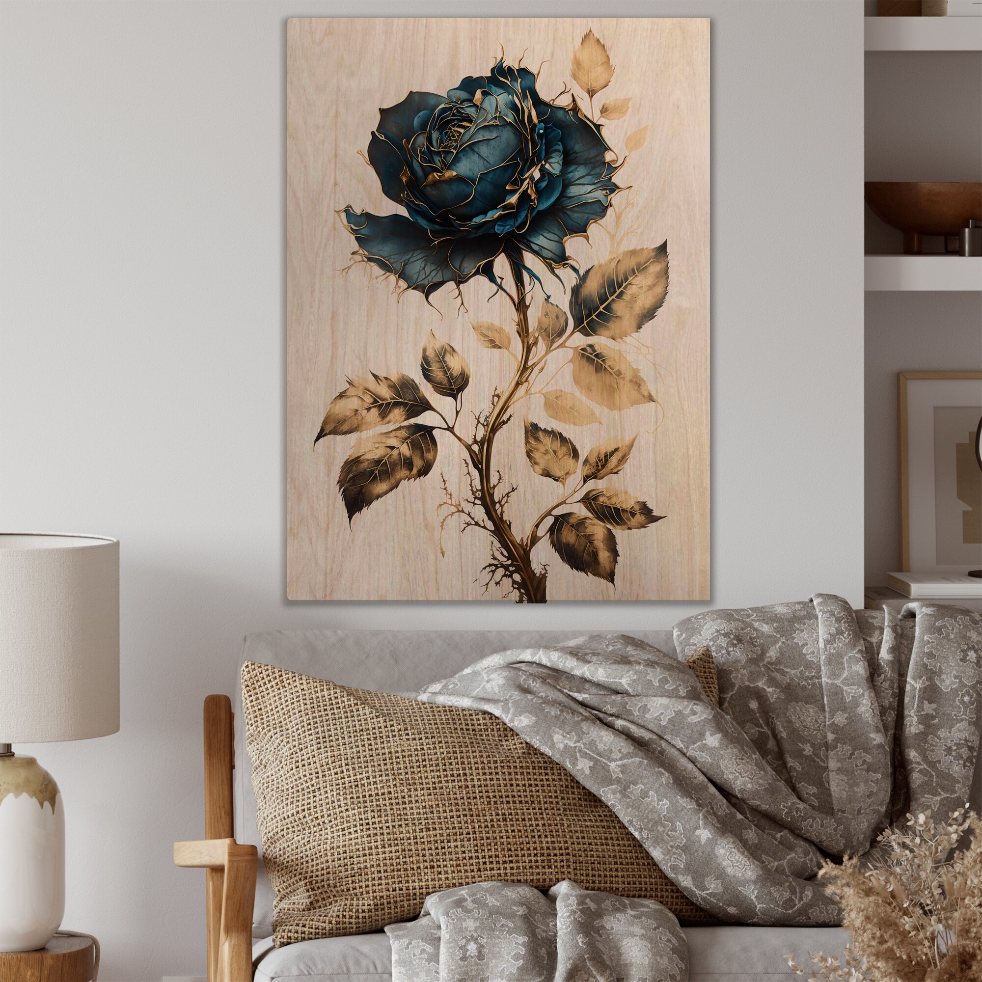 Designart 'Blue And Gold Painted Rose on White I' Floral Rose Wood Wall Art - Natural Pine Wood