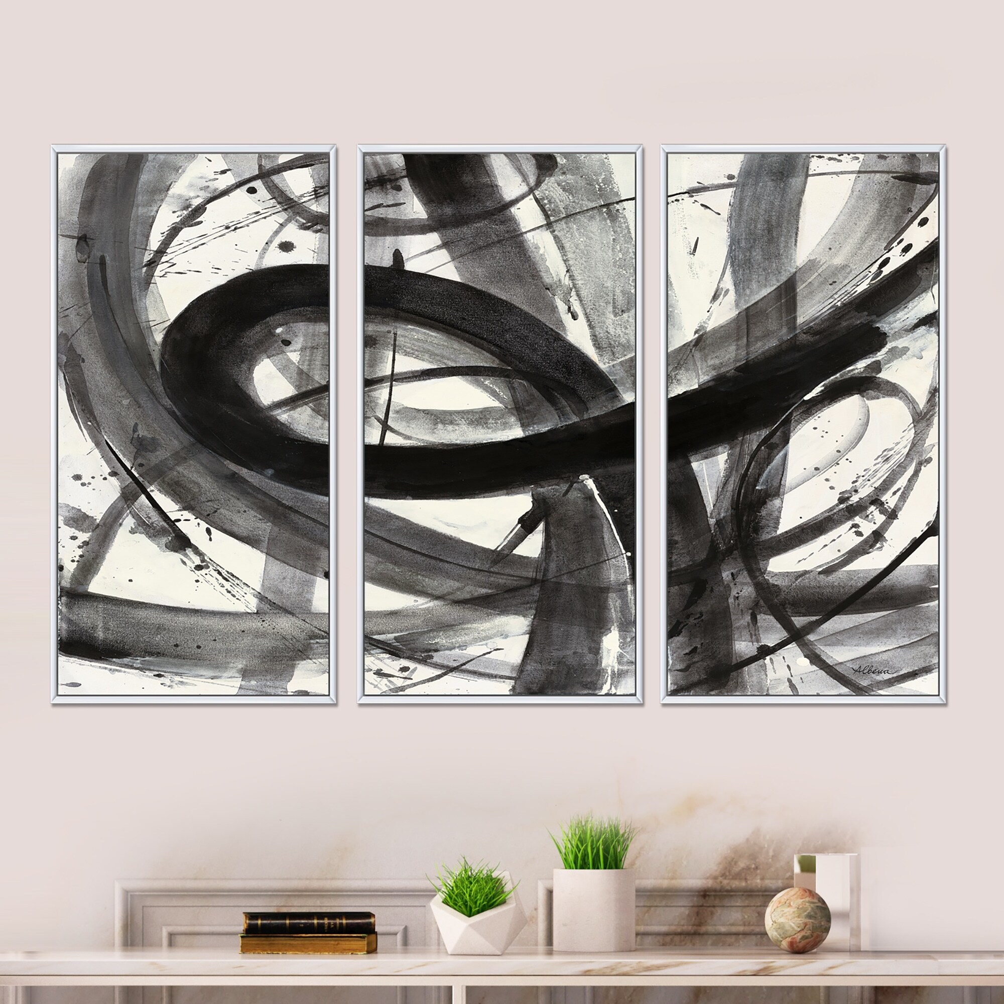 Designart "Black and White Minimalistic Painting" Modern & Contemporary Framed Canvas Wall Art Print - 3 Panels
