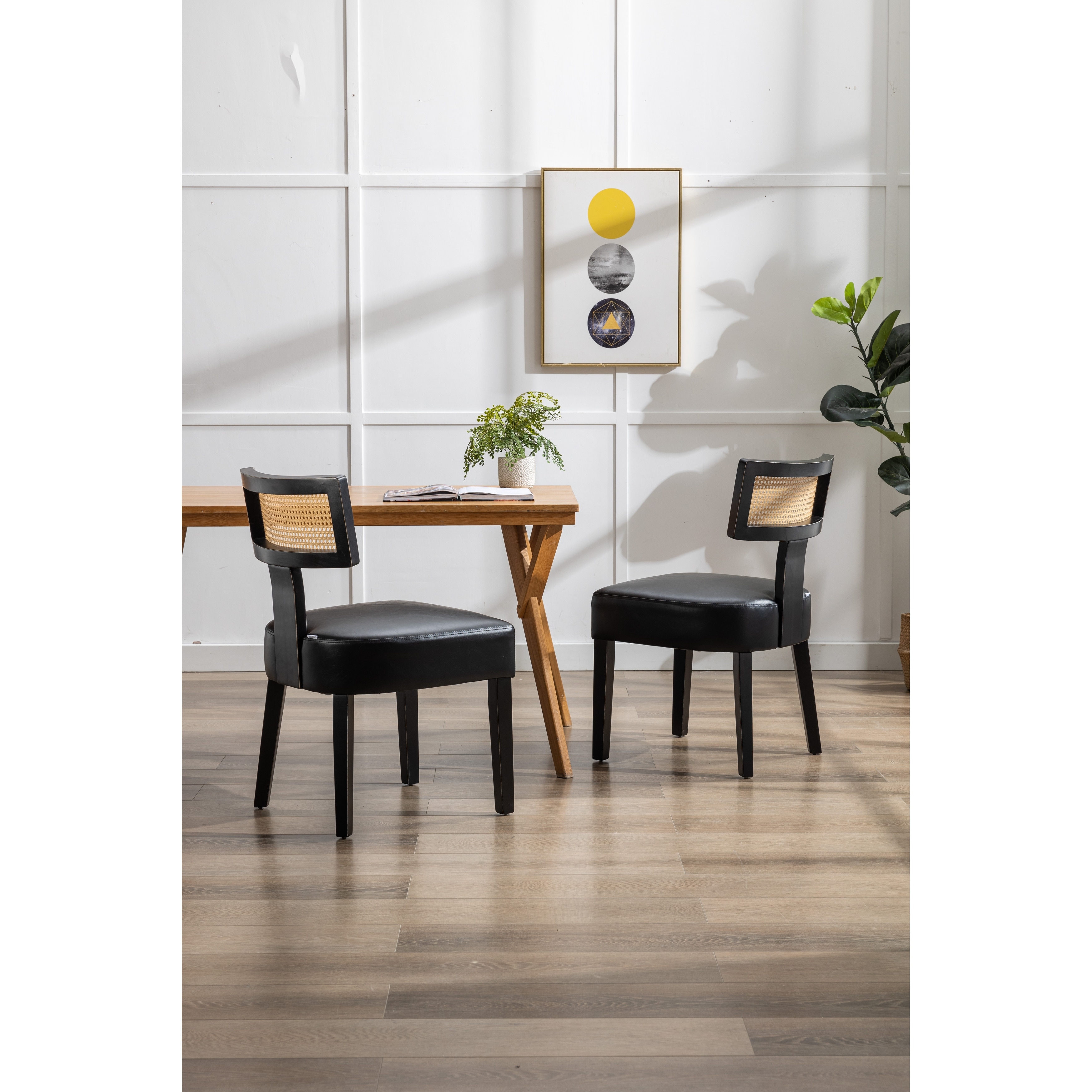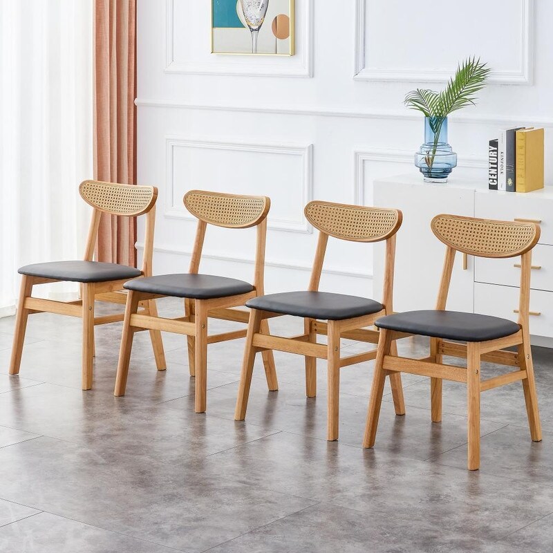 Solid Wood Dining Chair with Curved Rattan Backrest and PU Foam Cushion,Set of 4