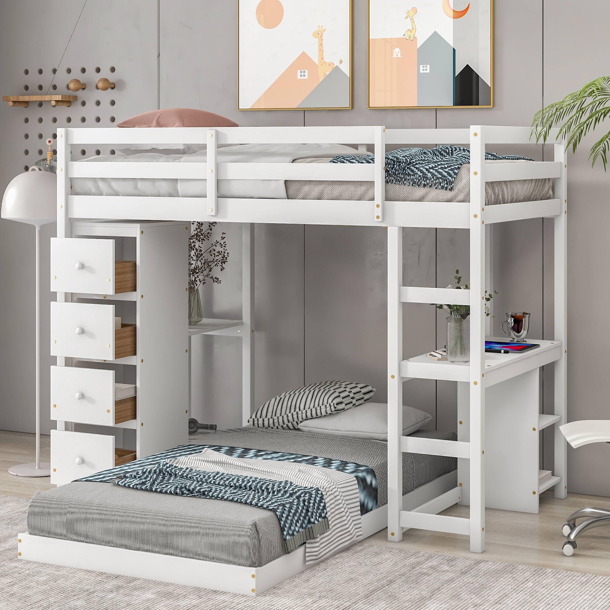 Wooden Loft Bed with Desk, Drawers, Cabinet and Shelves