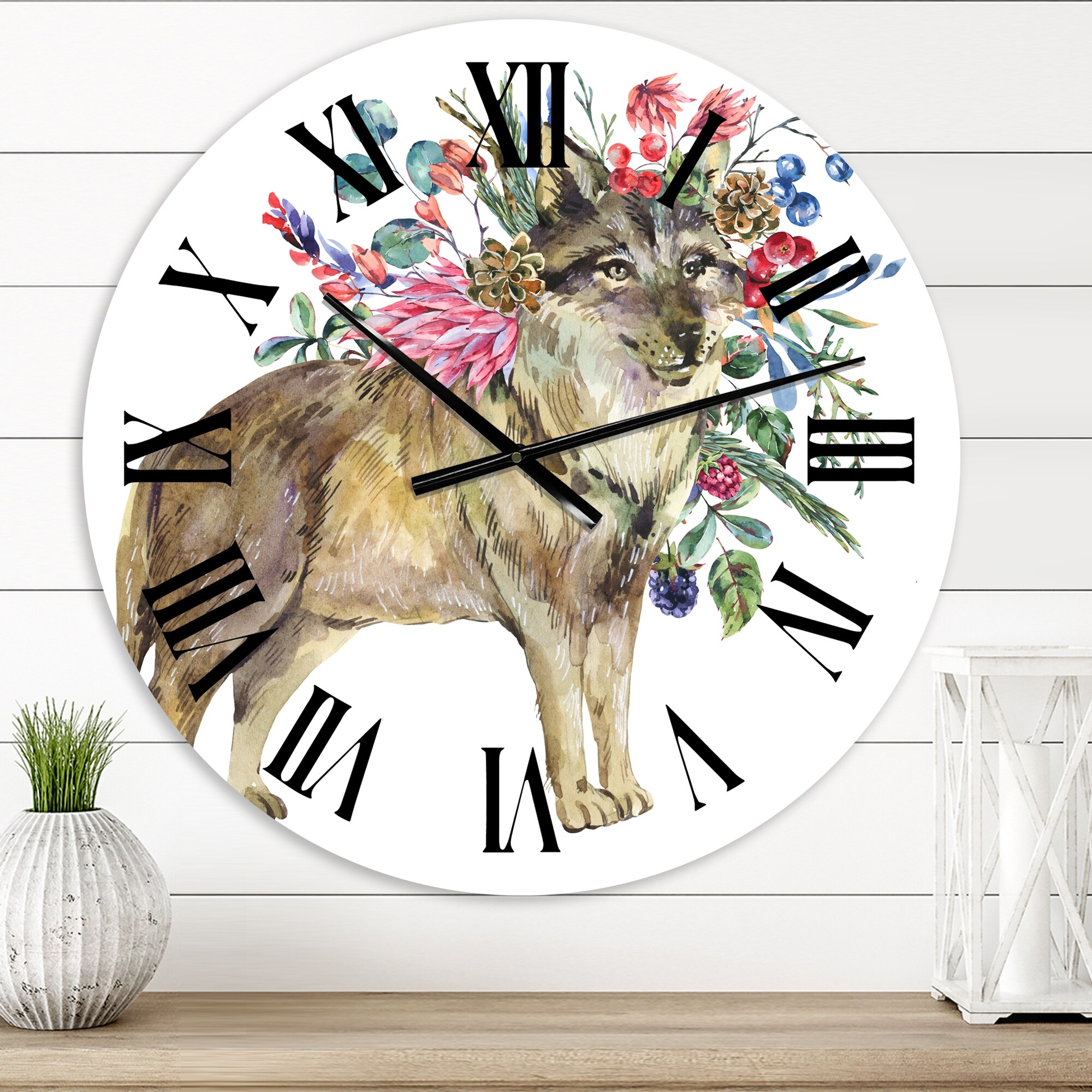 Designart 'Wolf With Woodland Flowers' Farmhouse wall clock