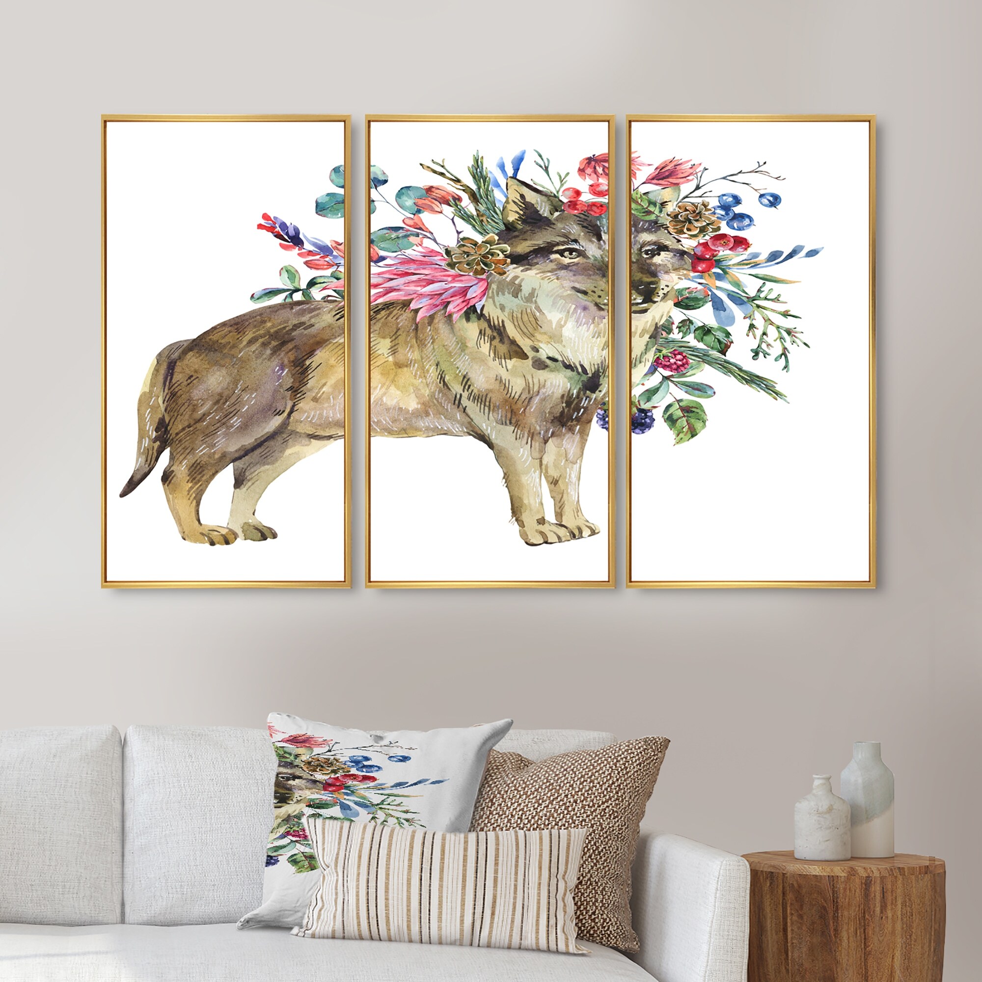Designart "Wolf With Woodland Flowers" Farmhouse Framed Art Set of 3 - 4 Colors of Frames