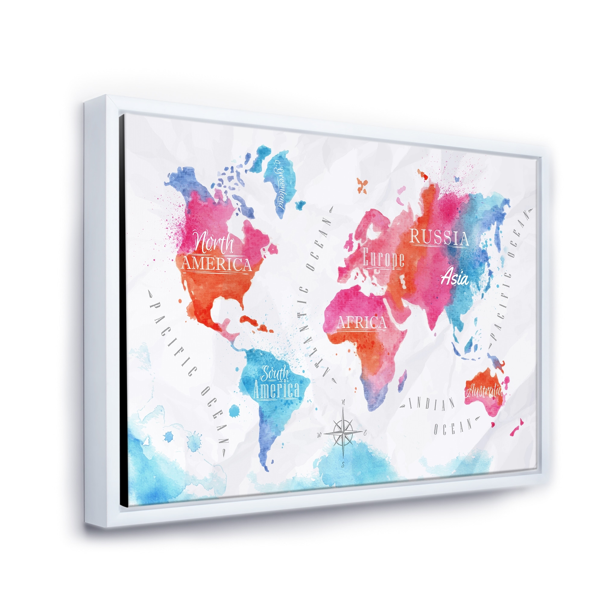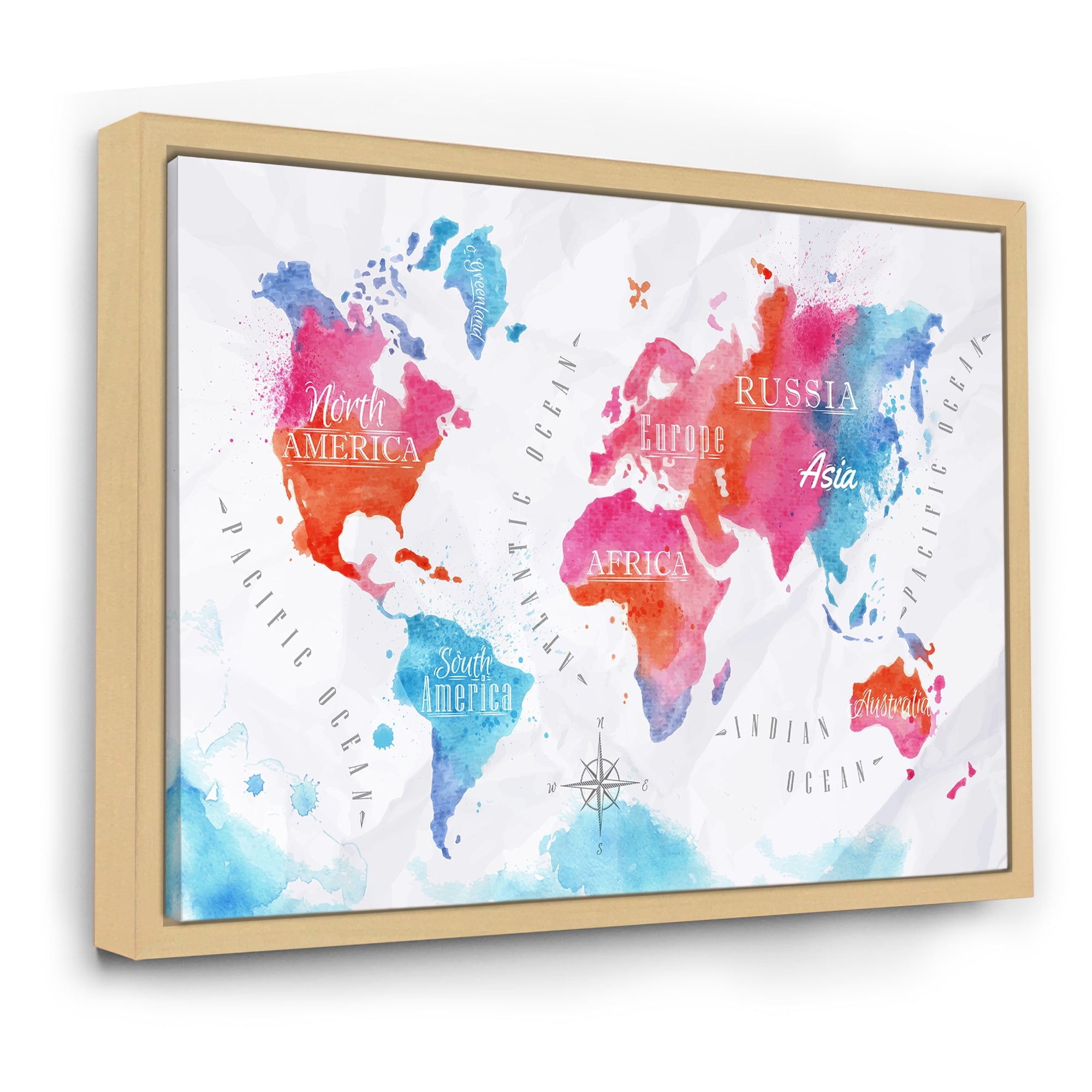 Designart "World Map in Pink and Blue" Modern Framed Canvas Wall Art Print