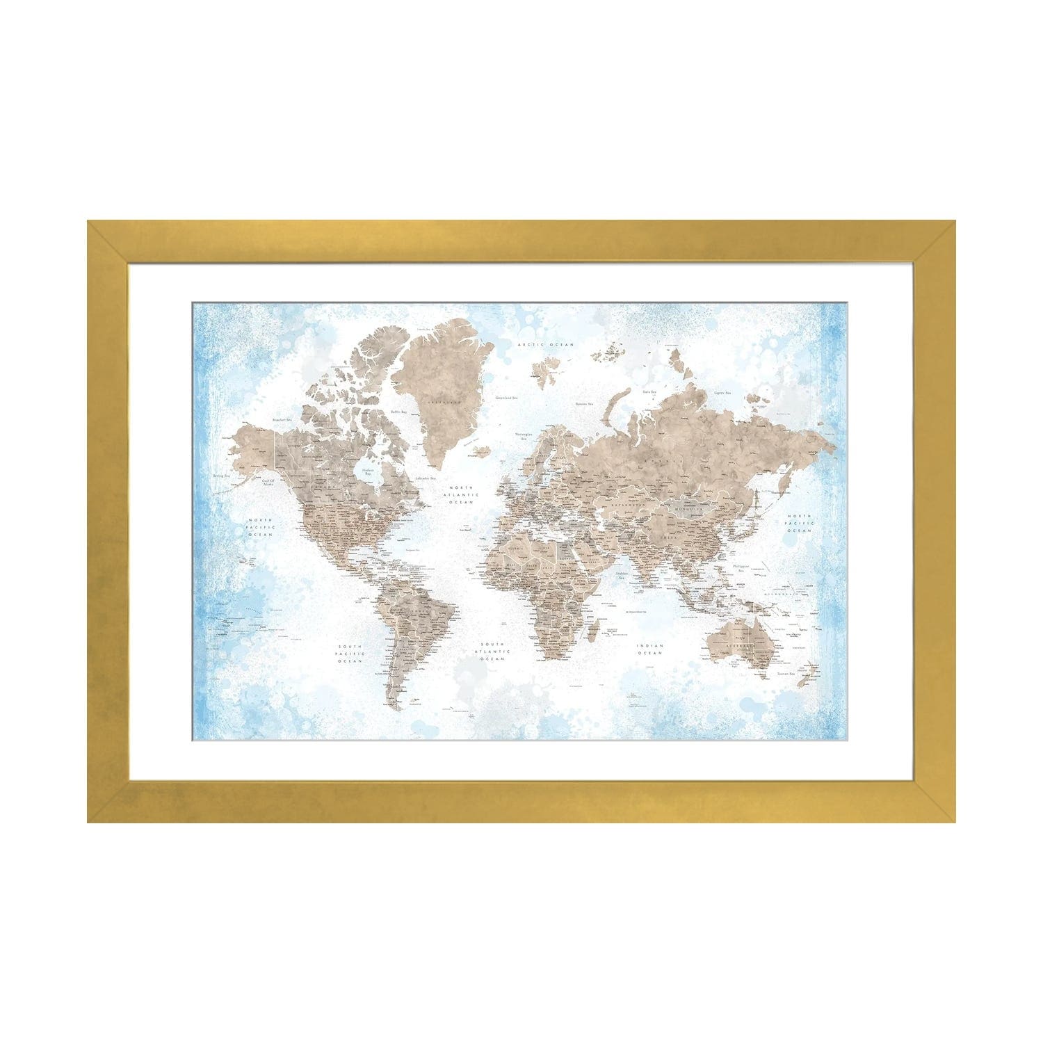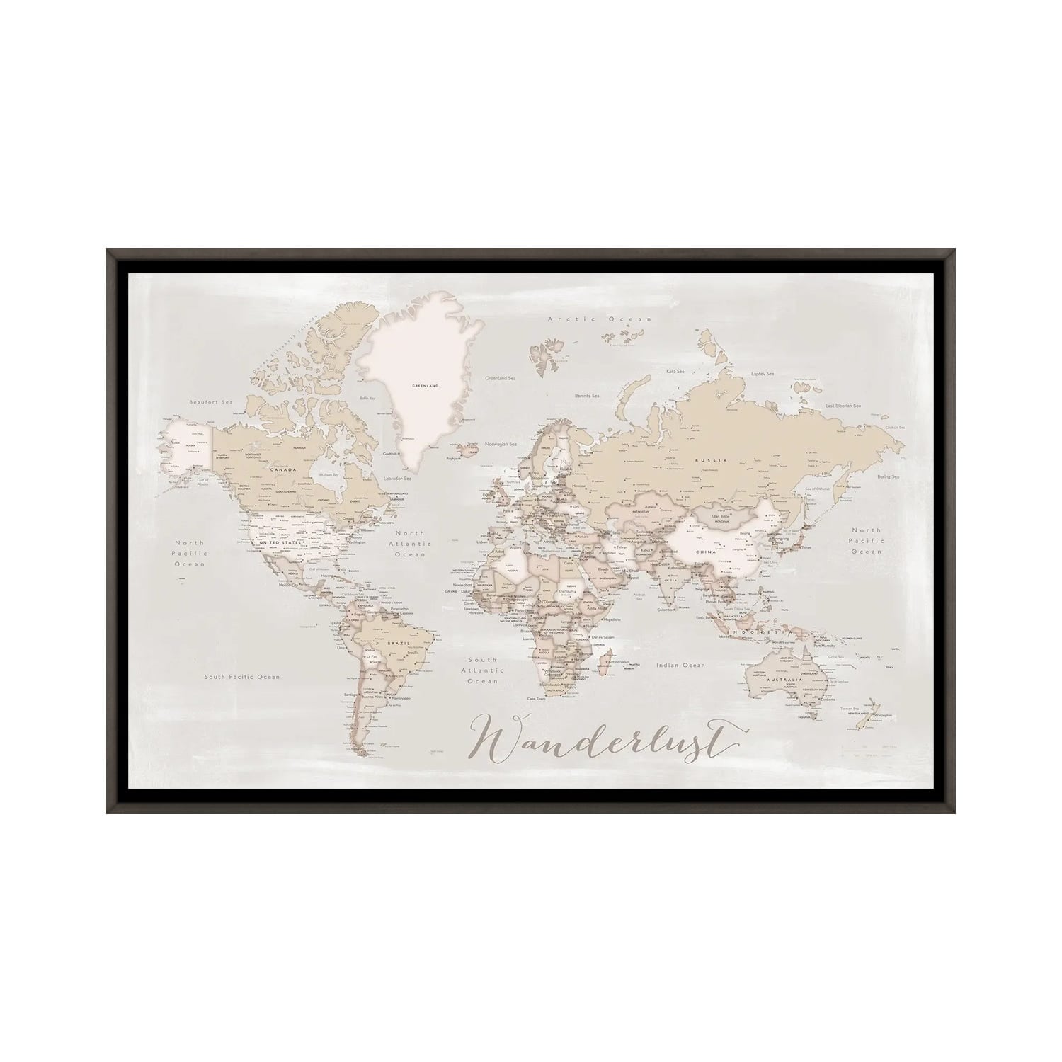 iCanvas "Pacific-Centered Detailed World Map in Neutral Watercolor" by blursbyai Framed Canvas Print