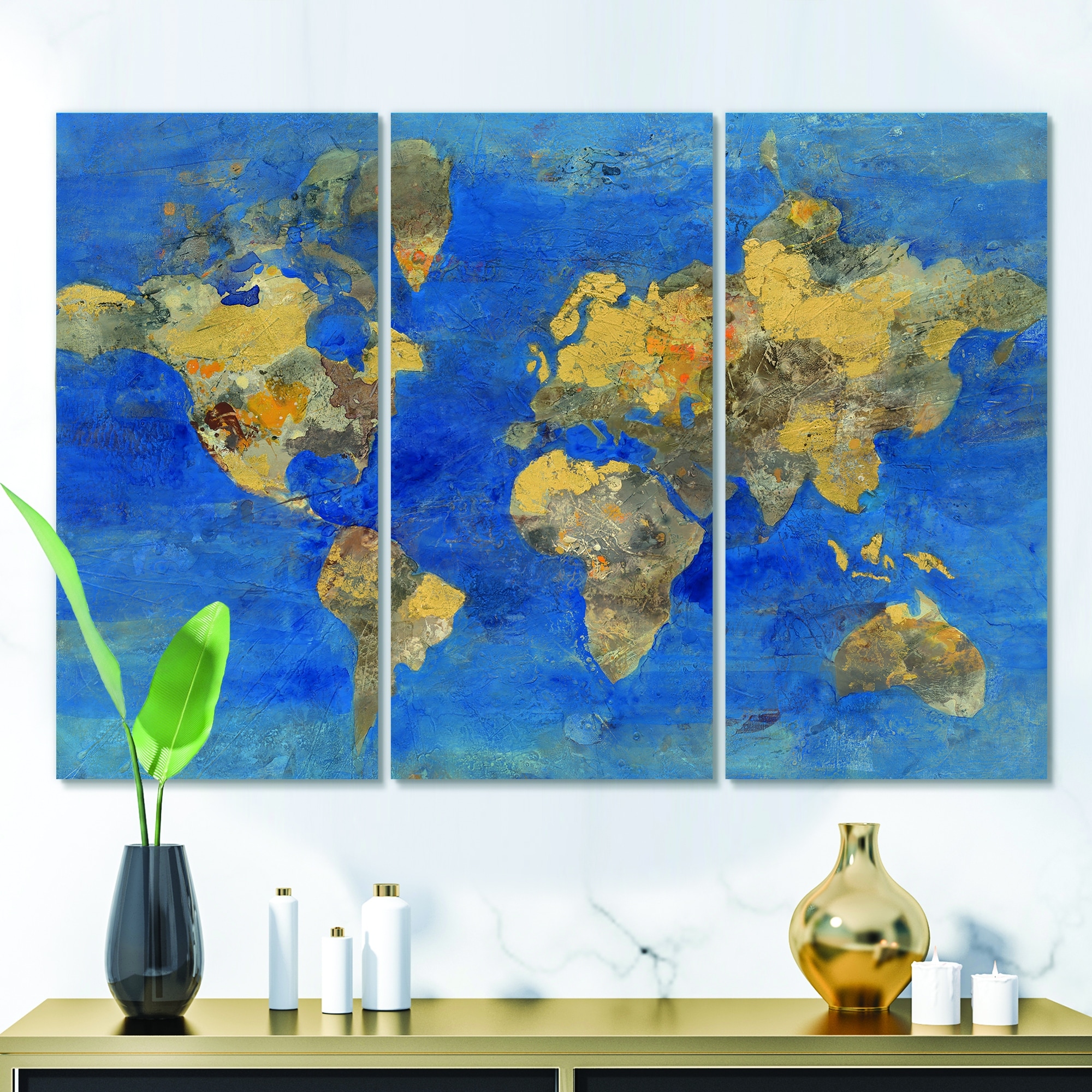 Designart "Golden Blue World Map" Traditional Framed Canvas Wall Art Print Set of 3 - 4 Colors of Frames