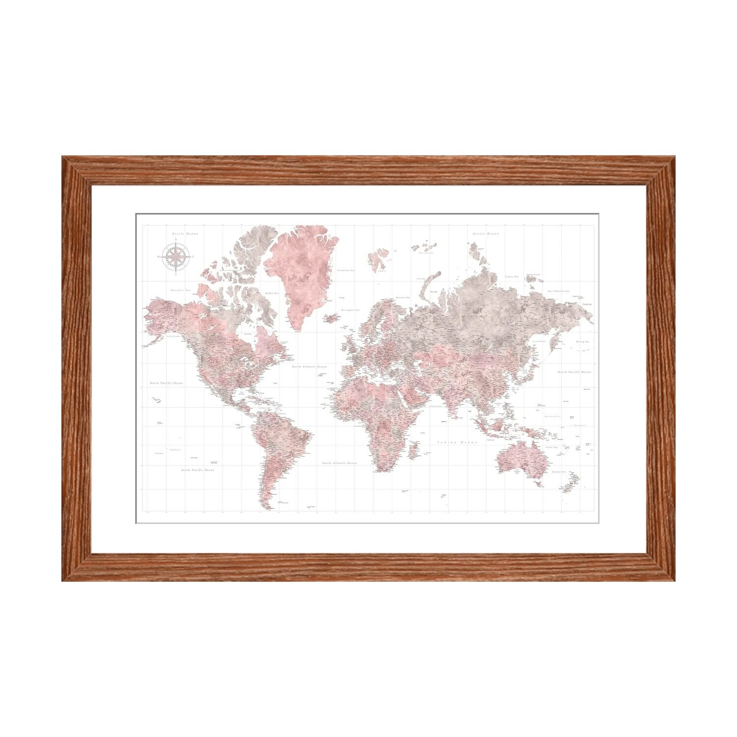 iCanvas "World Map in Dusty Pink And Gray With Compass" by blursbyai