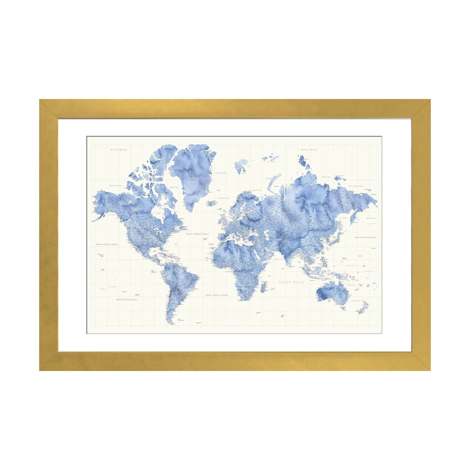iCanvas "Watercolor World Map Navy Blue" by Nouveau Prints Framed Canvas Print