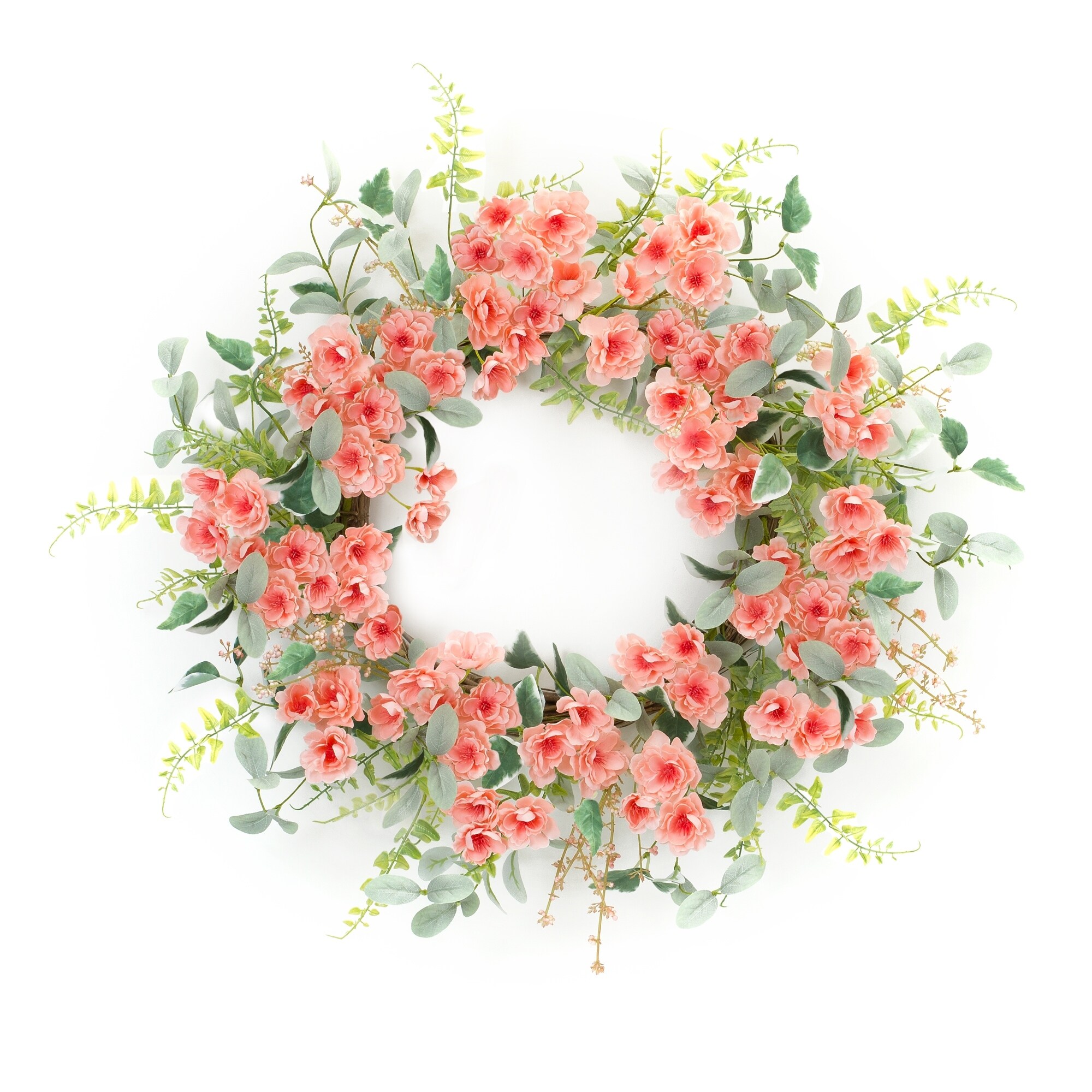 Hydrangea and Fern Spring Floral Berry Wreath, Green and Pink 28"