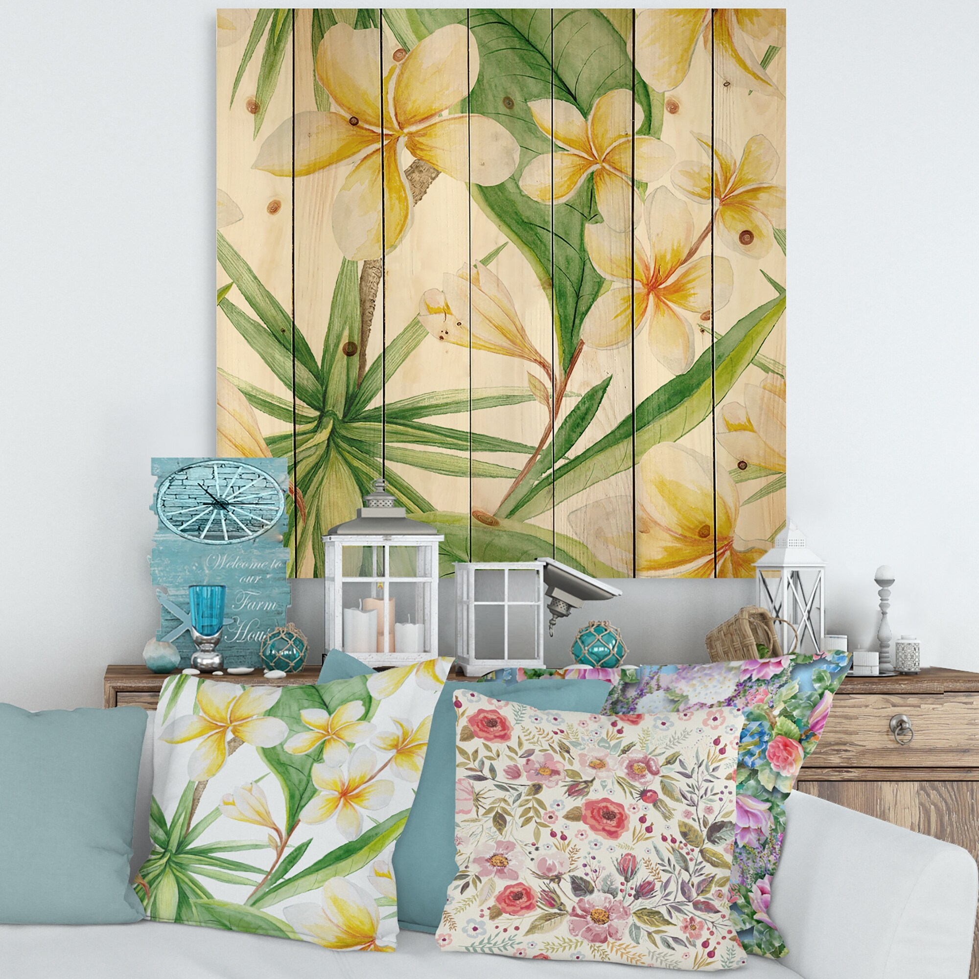 Designart 'Tropical Foliage and Yellow Flowers X' Traditional Print on Natural Pine Wood