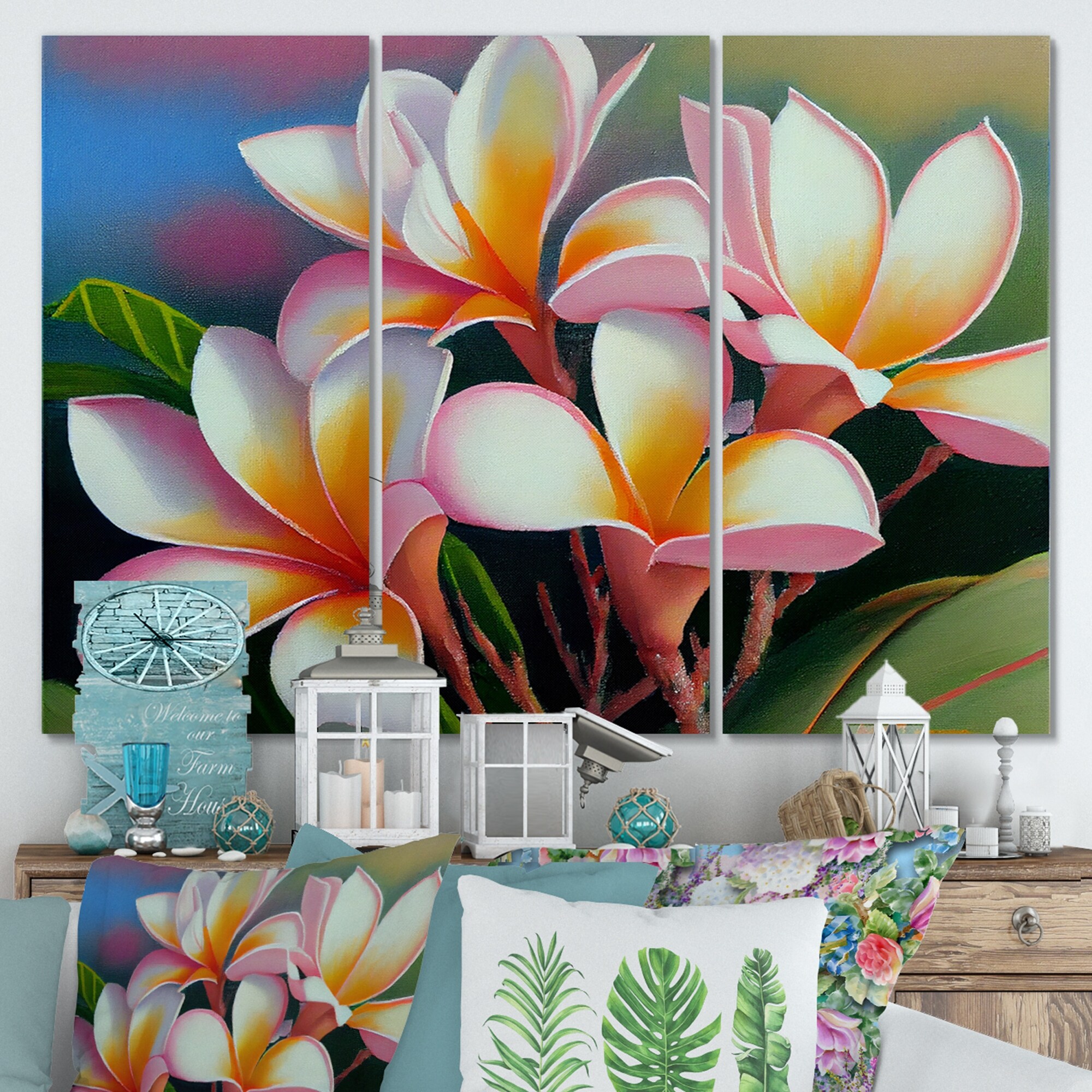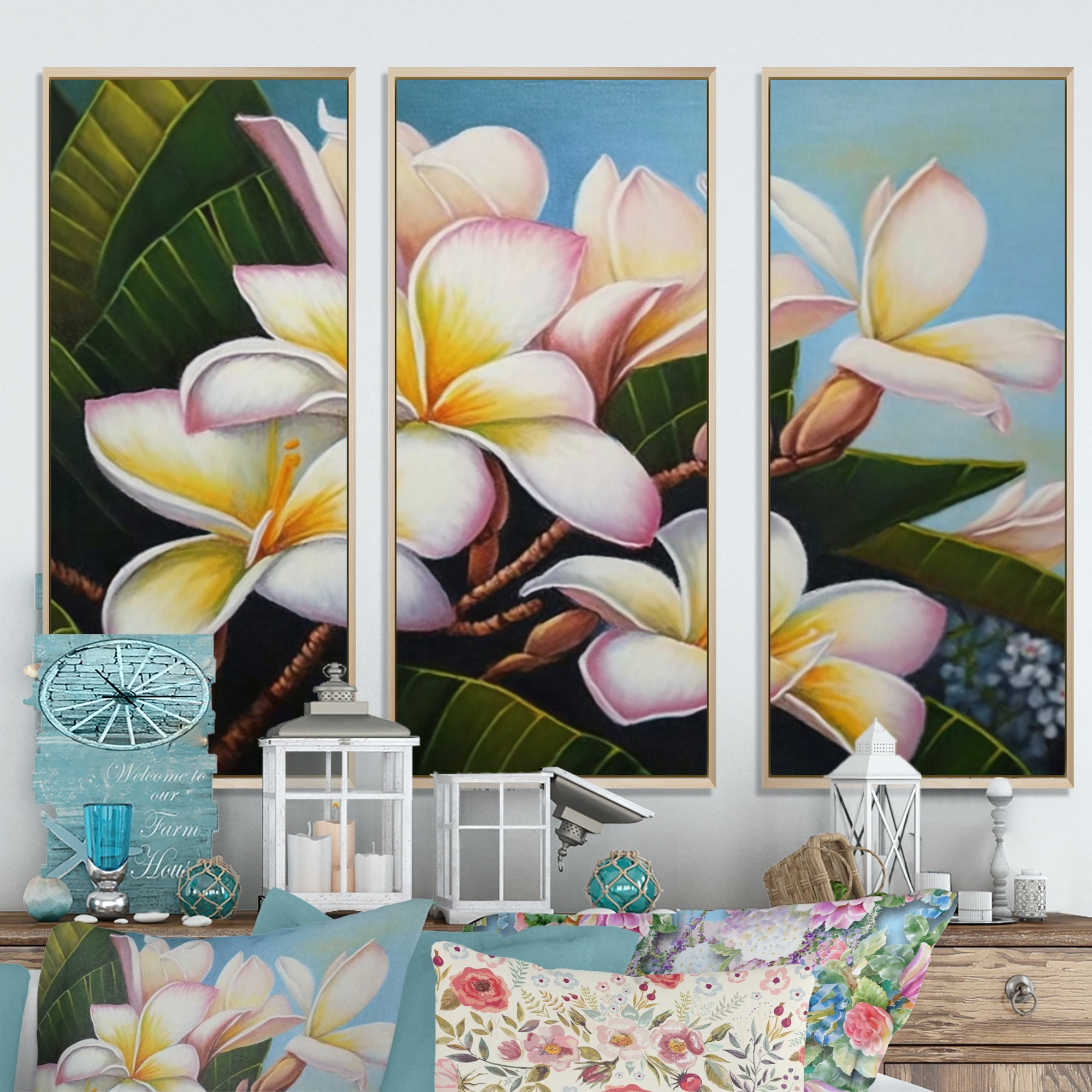 Designart "White And Yellow Blossoming Plumeria I" Floral Framed Canvas Wall Art Print - 3 Panels